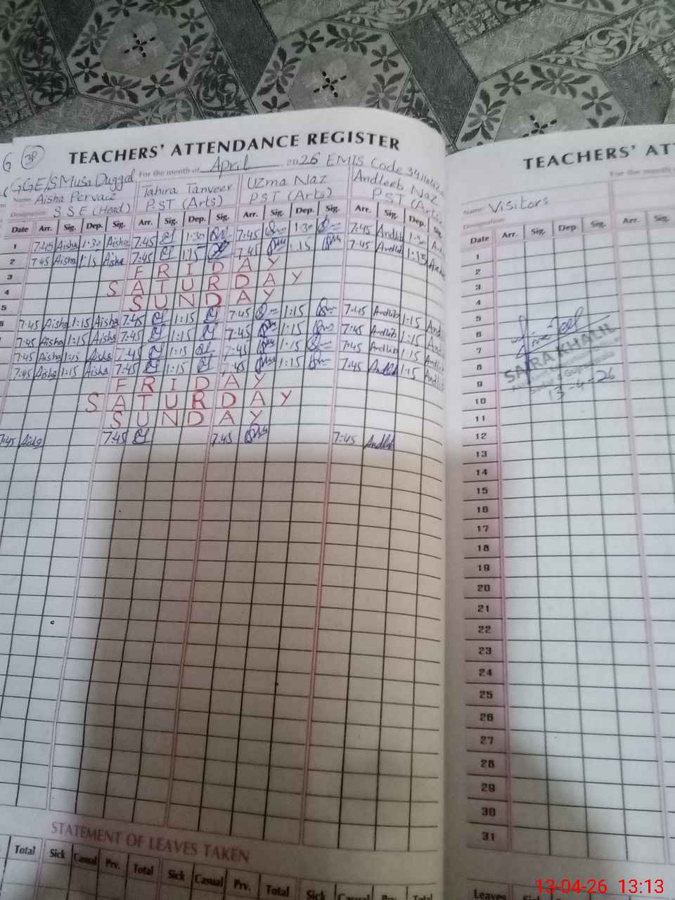 | Leave | Duty | Absent | Maternity | Medical | Ex- Pak |