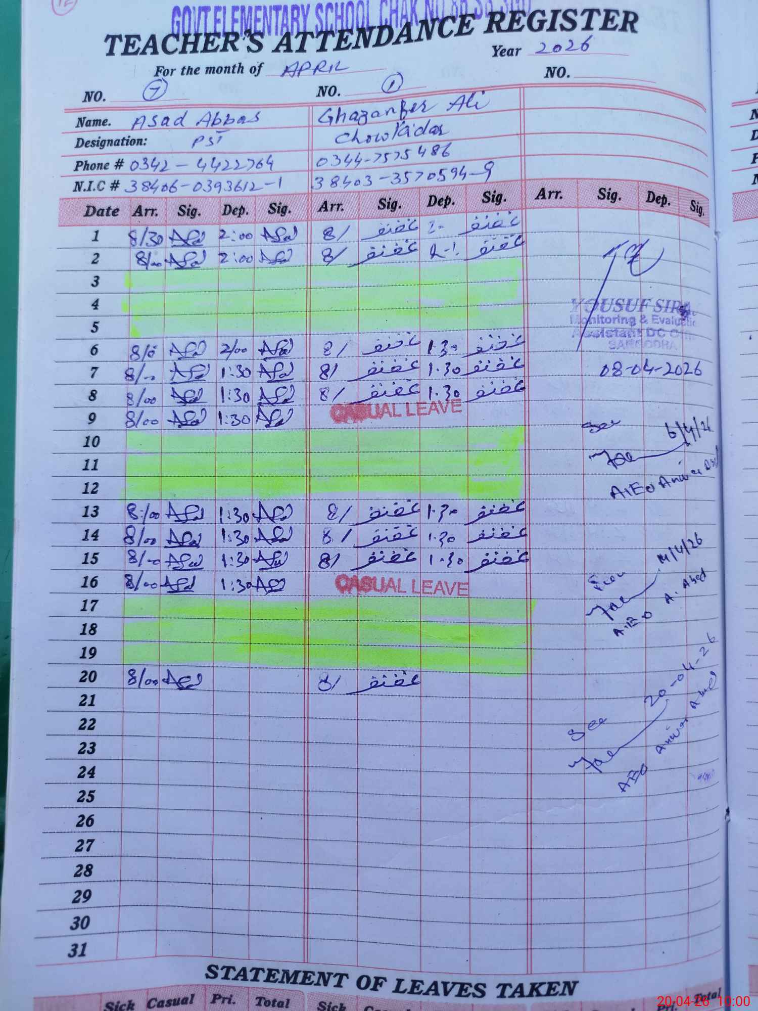 | CNIC | Full Name | Designation | R/C | Absence during last cal. month |