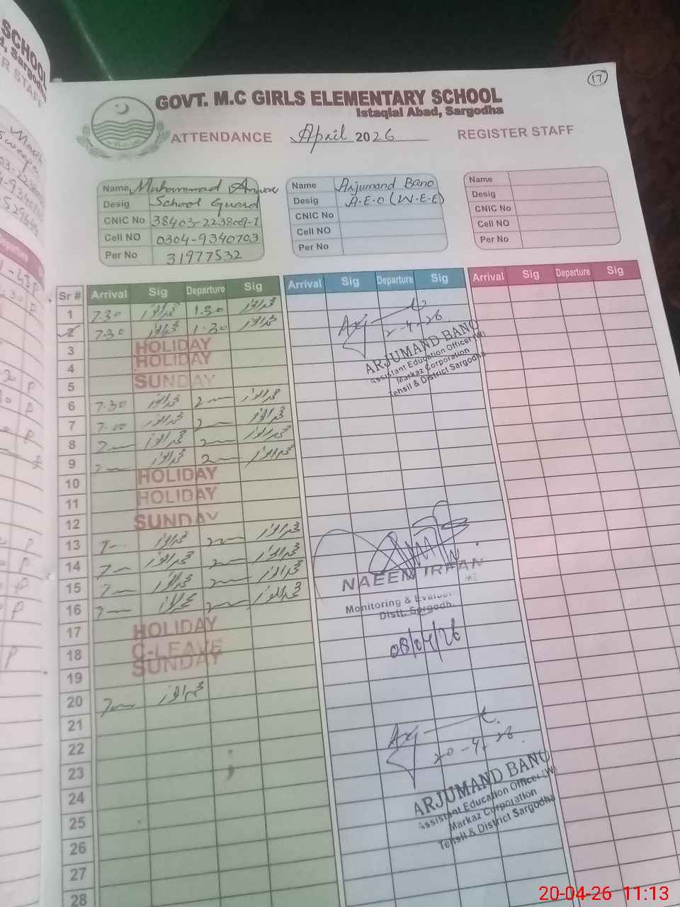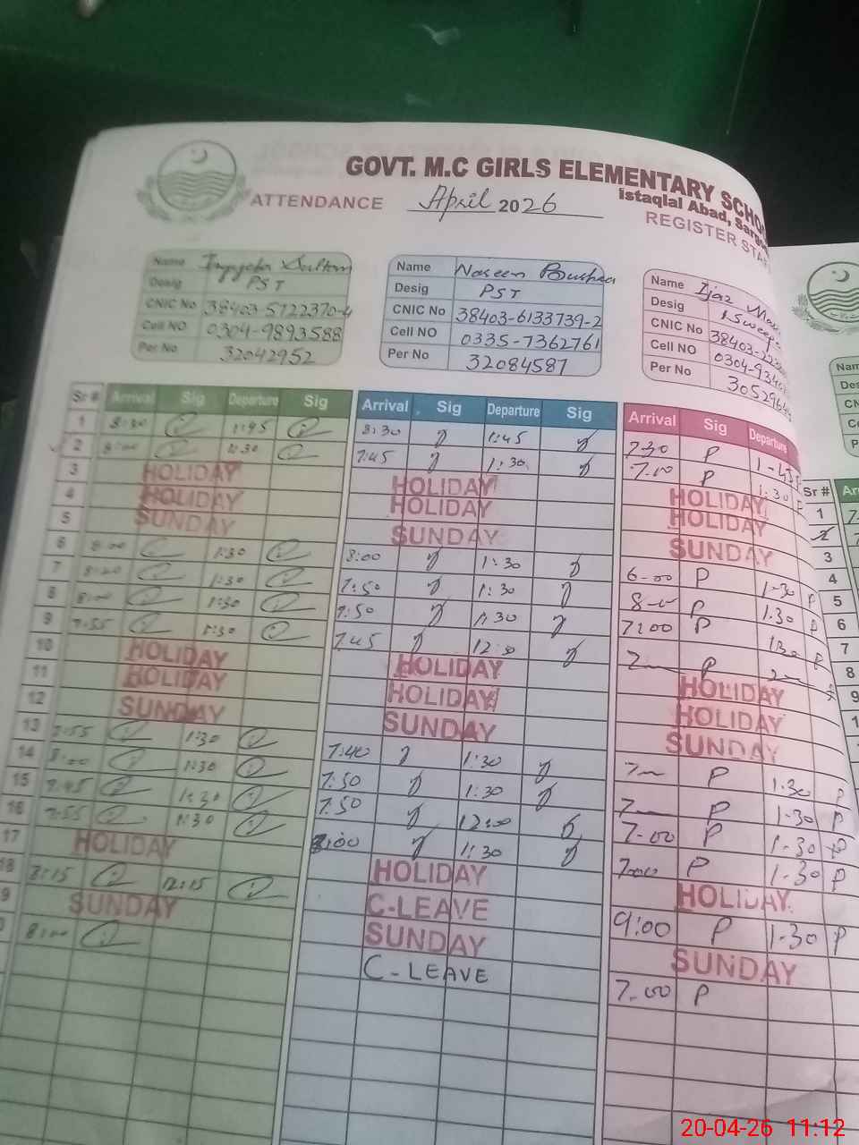 | CNIC | Full Name | Designation | R/C | Absence During Last Calender Month |