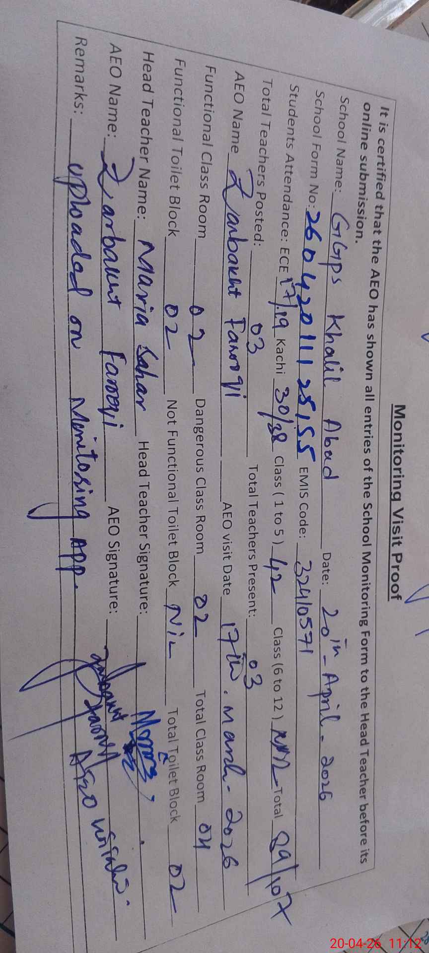 | Attendance Register | Head Teacher | MEA with School | Visit Proof |