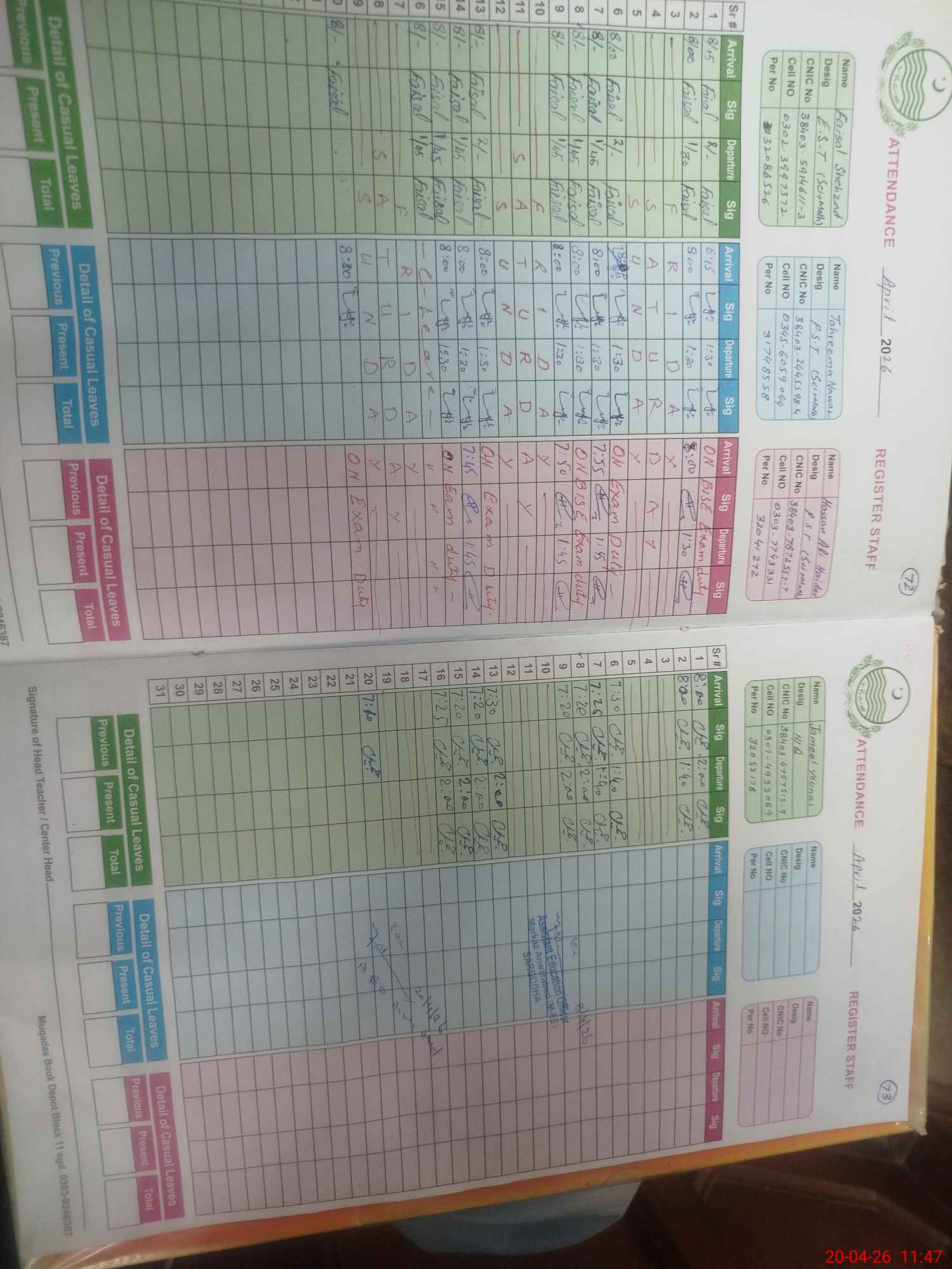 | CNIC | Full Name | Designation | R/C | Absence During Last Calender Month |