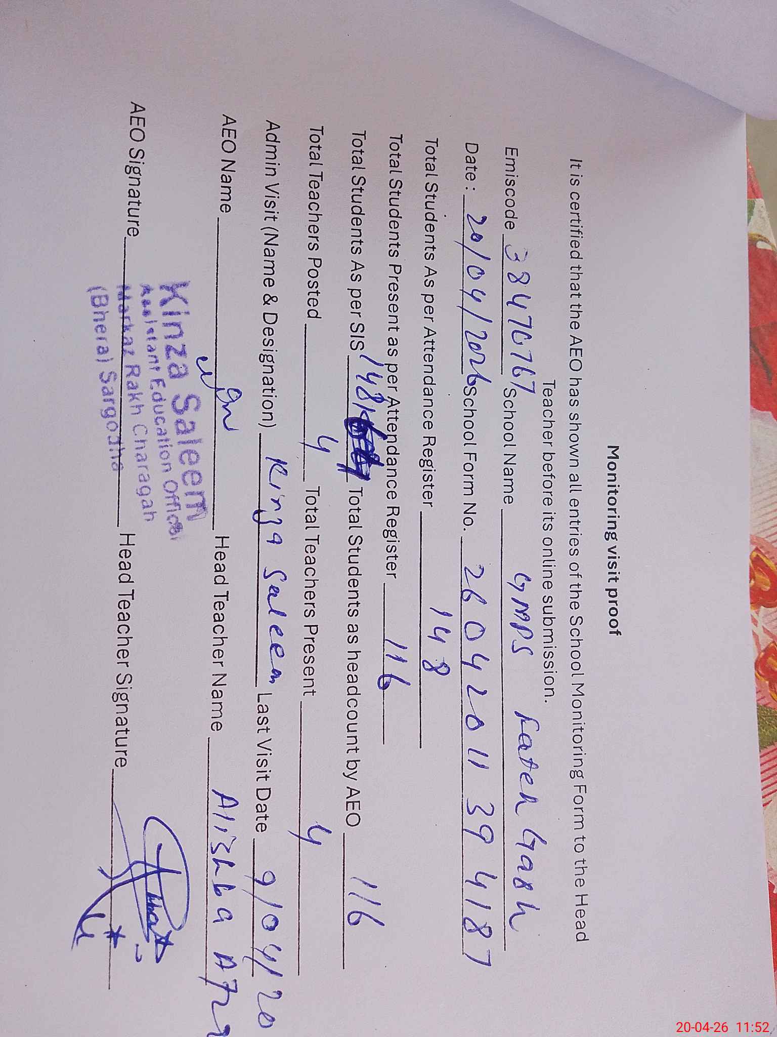 | Attendance Register | Head Teacher | MEA with School | Visit Proof |