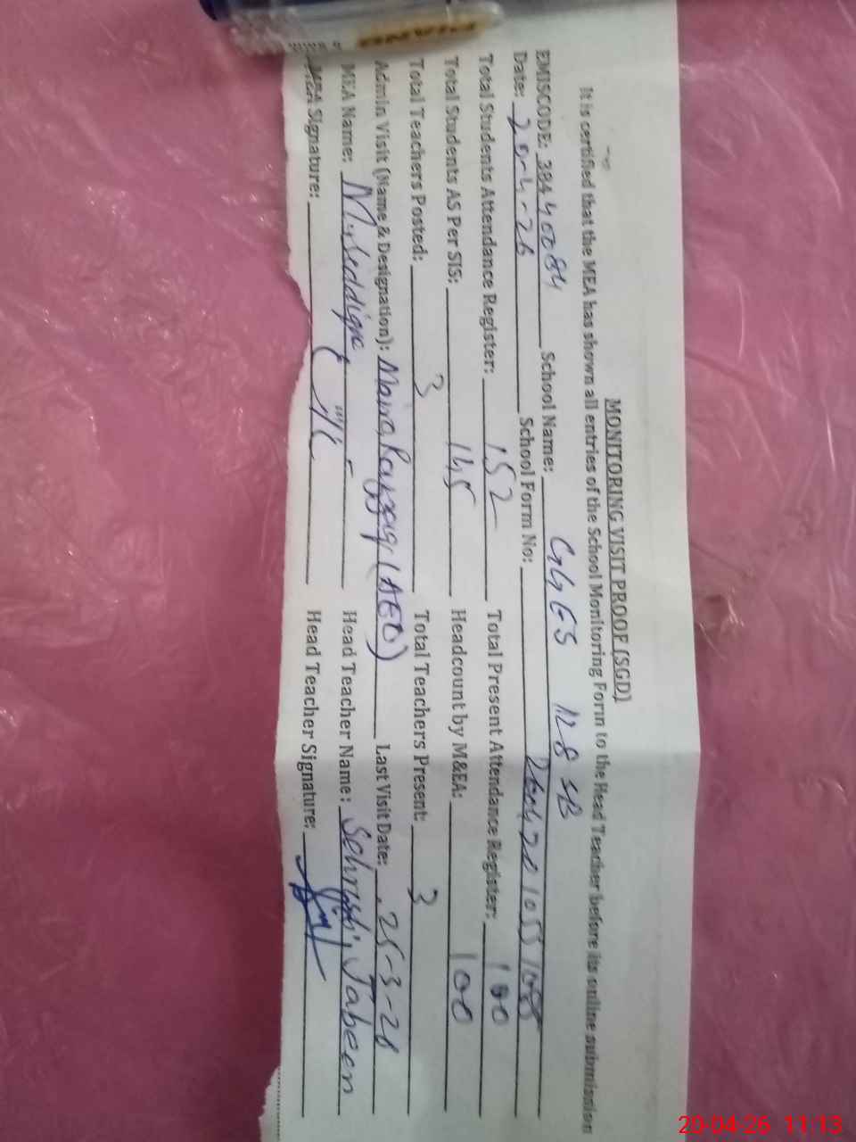 | Attendance Register | Head Teacher | MEA with School | Visit Proof |