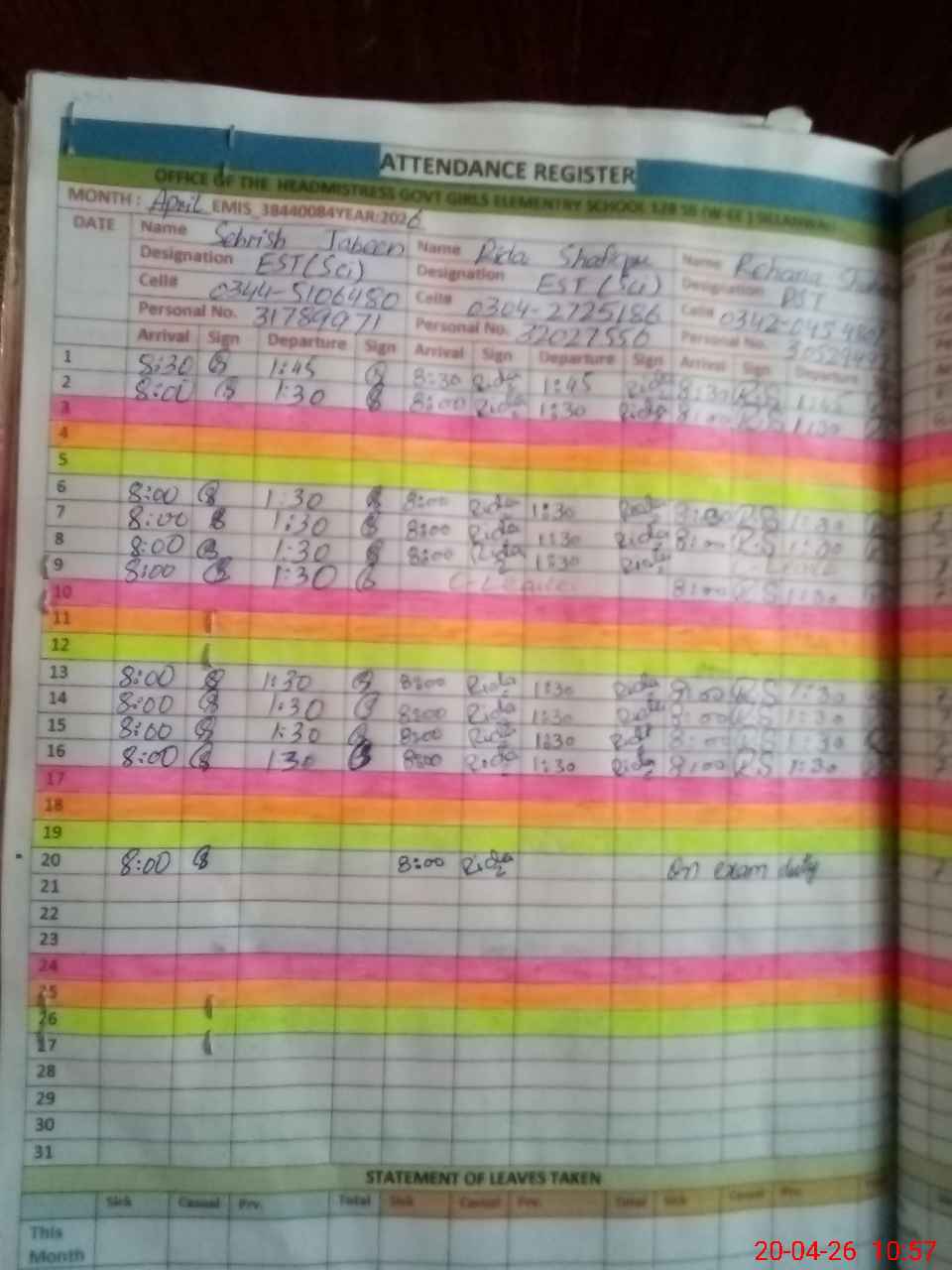 | 38**** | Re**** Sh**** | PST Arts | Regular | 2 | 0 | 0 | 0 | 0 | 0 | 0 | 0 | 2 | Exam Duty |