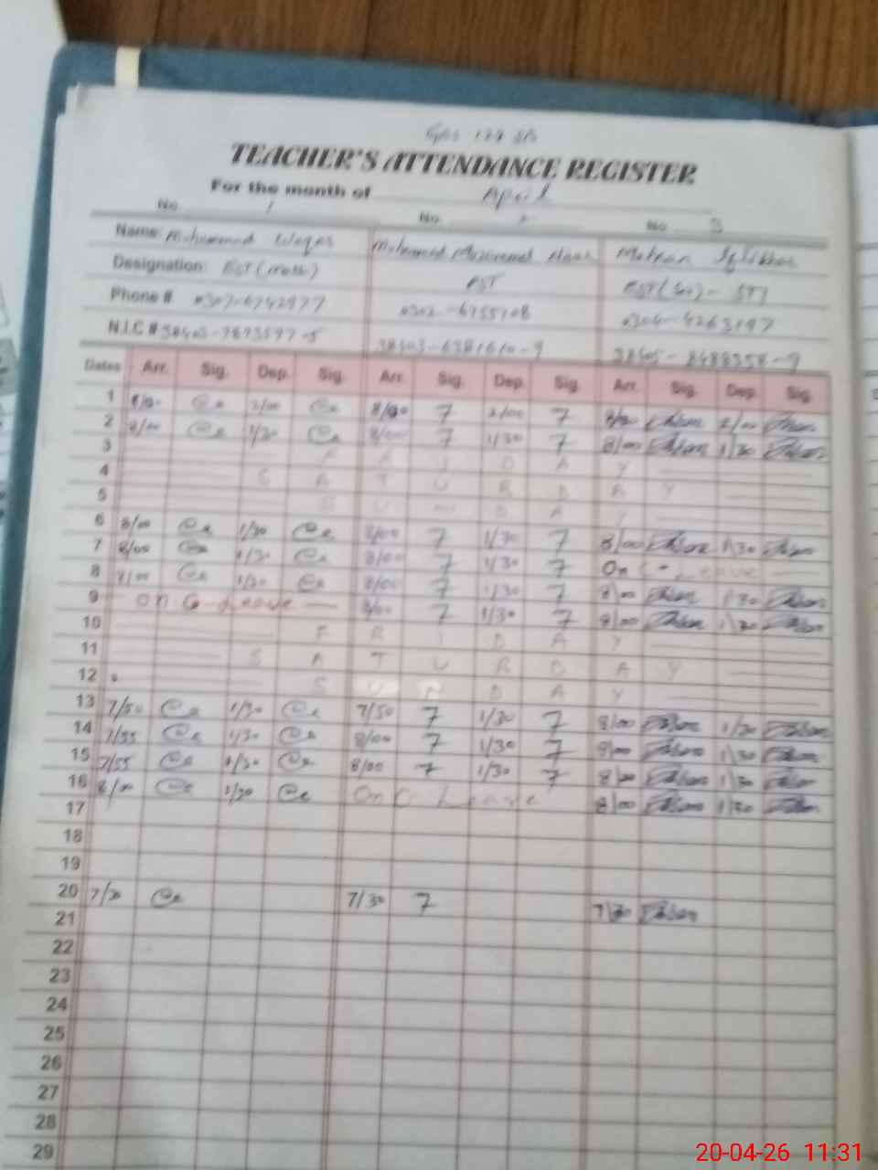 | CNIC | Full Name | Designation | R/C | Absence During Last Calender Month |