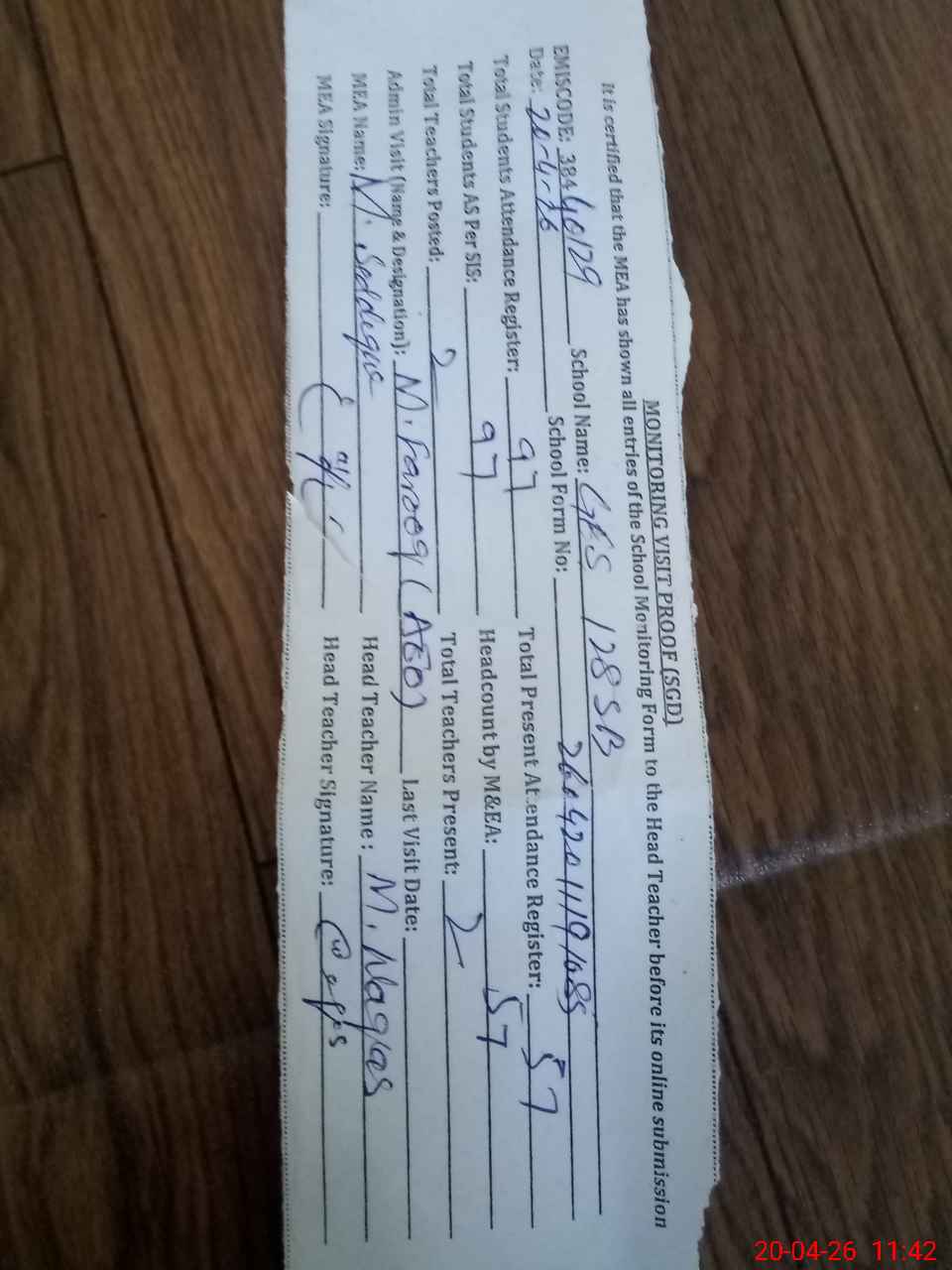 | Attendance Register | Head Teacher | MEA with School | Visit Proof |