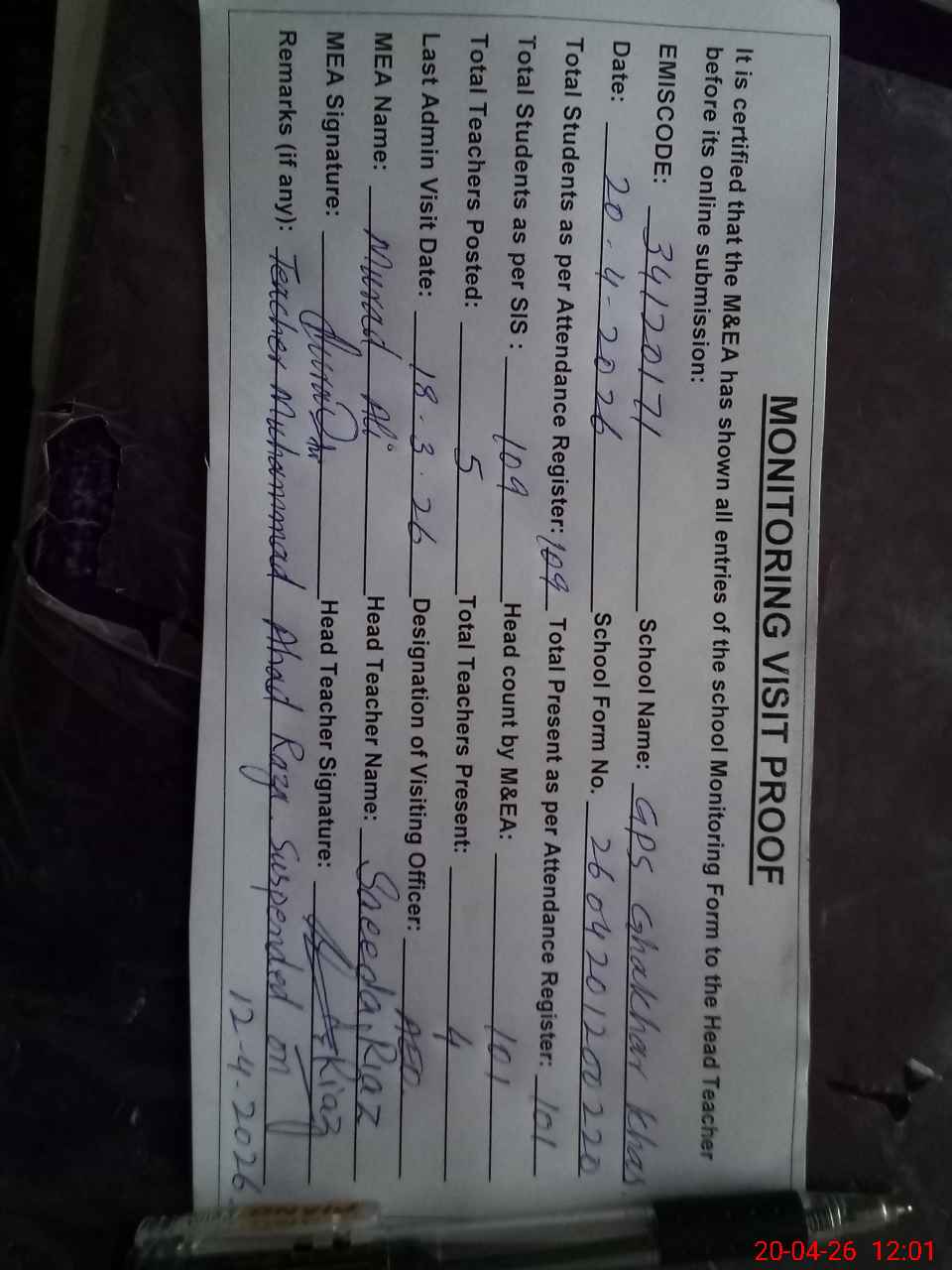 | EMIS Code: 34120171 | Name of School: GPS GHAKHAR KHAS | |||