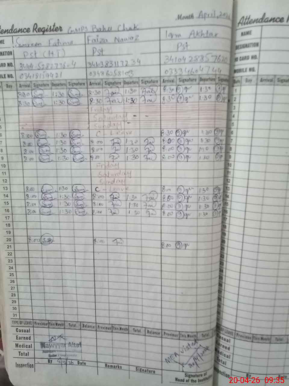 | CNIC | Full Name | Designation | R/C | Absence During Last Calender Month |