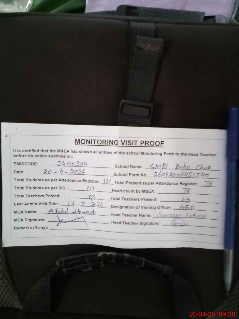 | Attendance Register | Head Teacher | MEA with School | Visit Proof |