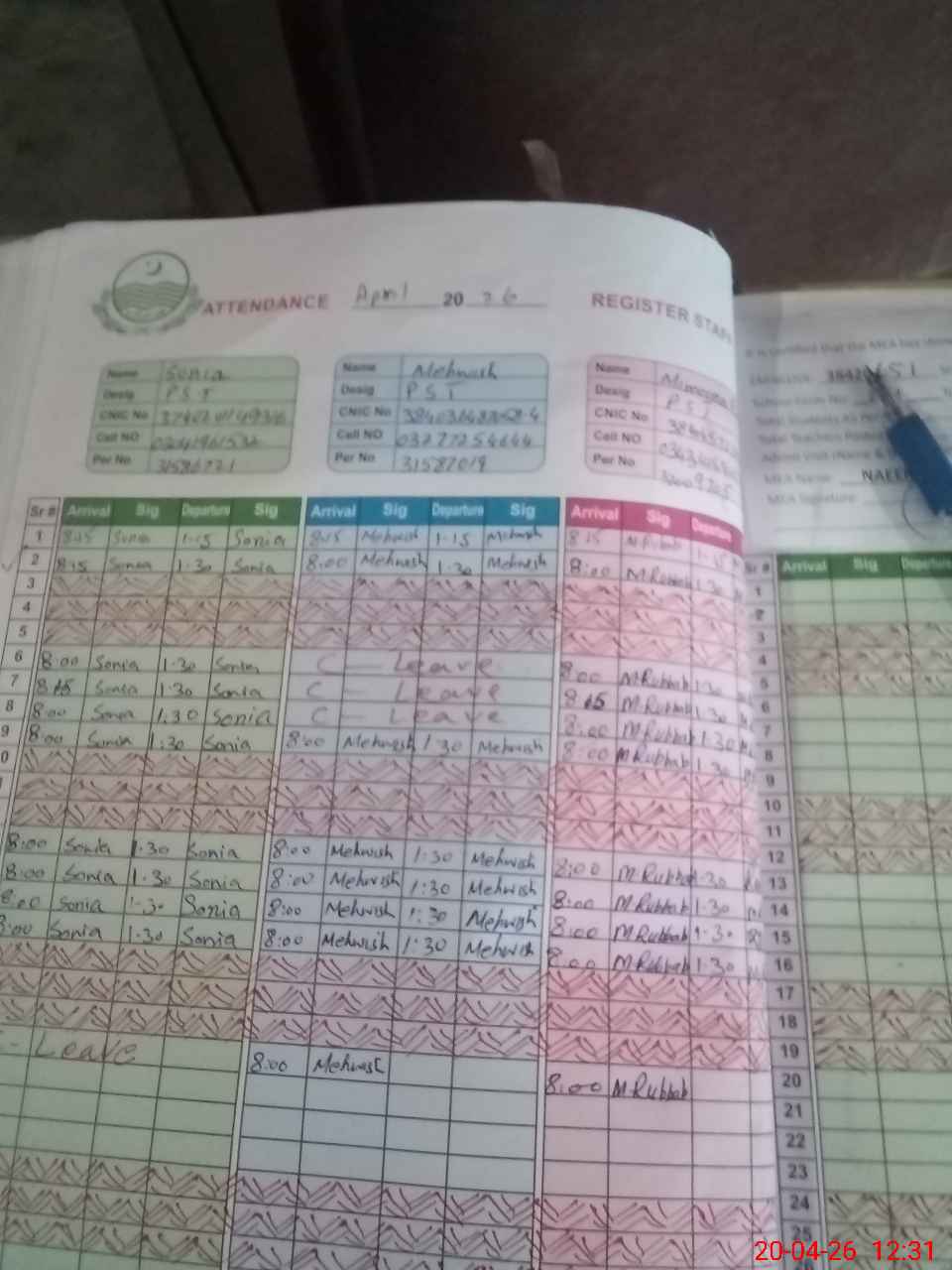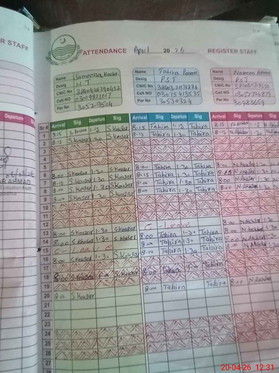 | CNIC | Full Name | Designation | R/C | Absence During Last Calender Month |