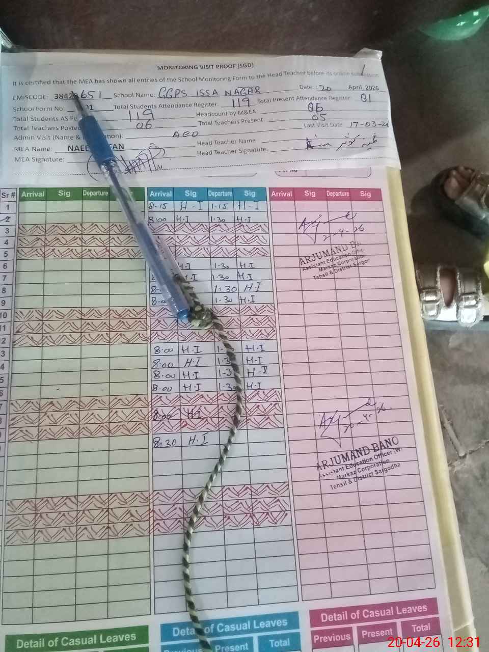 | Attendance Register | Head Teacher | MEA with School | Visit Proof |