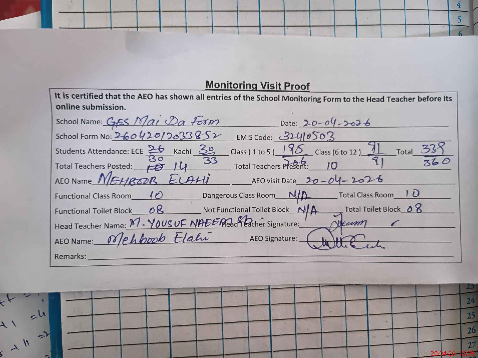 | Attendance Register | Head Teacher | MEA with School | Visit Proof |