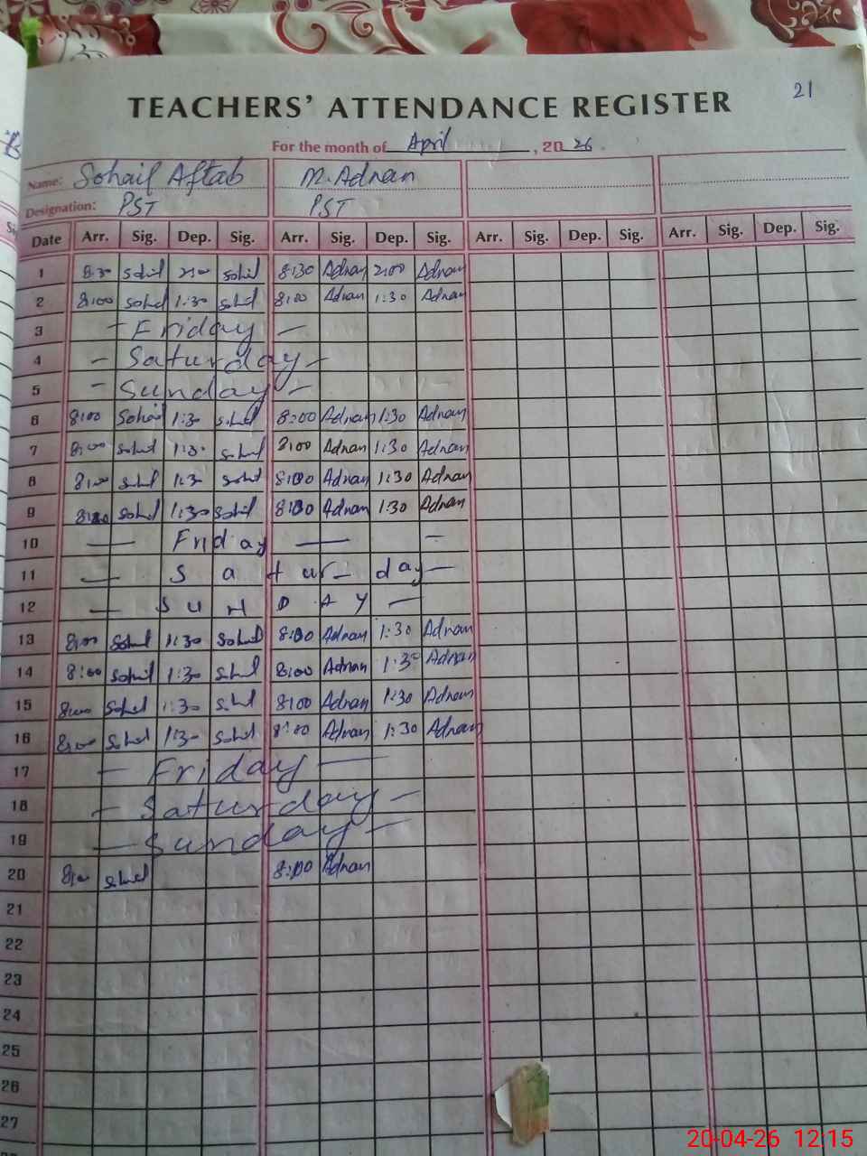 | CNIC | Full Name | Designation | R/C | Absence During Last Calender Month |