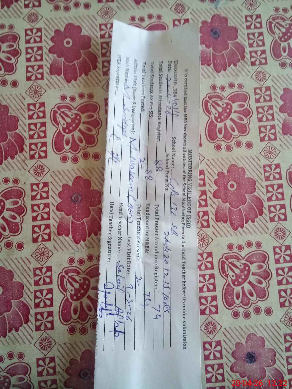 | Attendance Register | Head Teacher | MEA with School | Visit Proof |