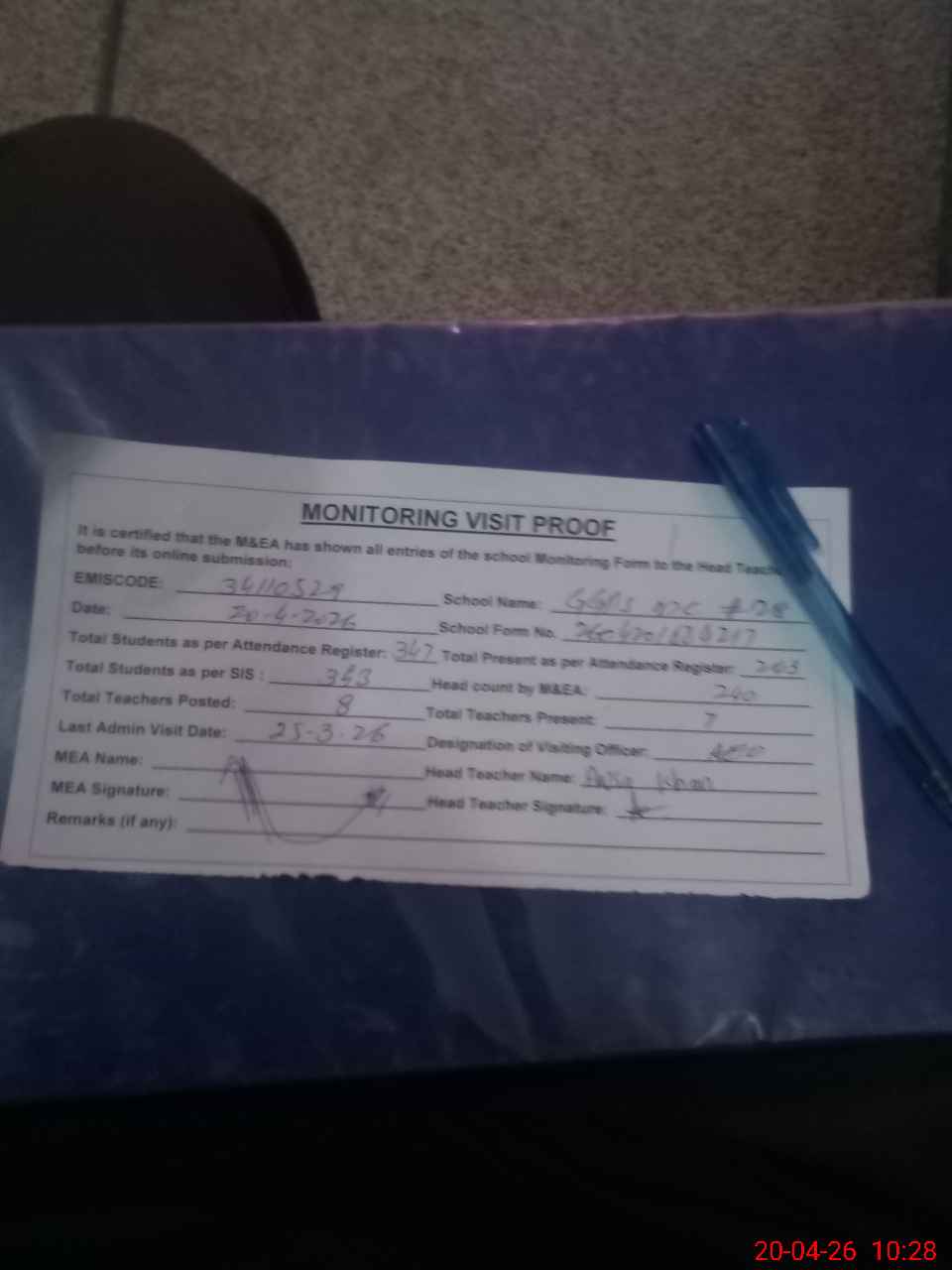 | Attendance Register | Head Teacher | MEA with School | Visit Proof |