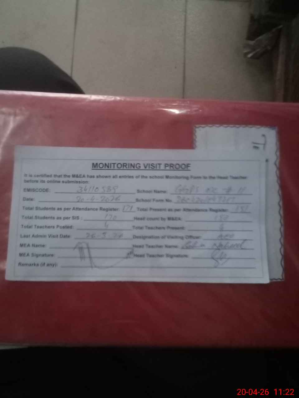 | Attendance Register | Head Teacher | MEA with School | Visit Proof |