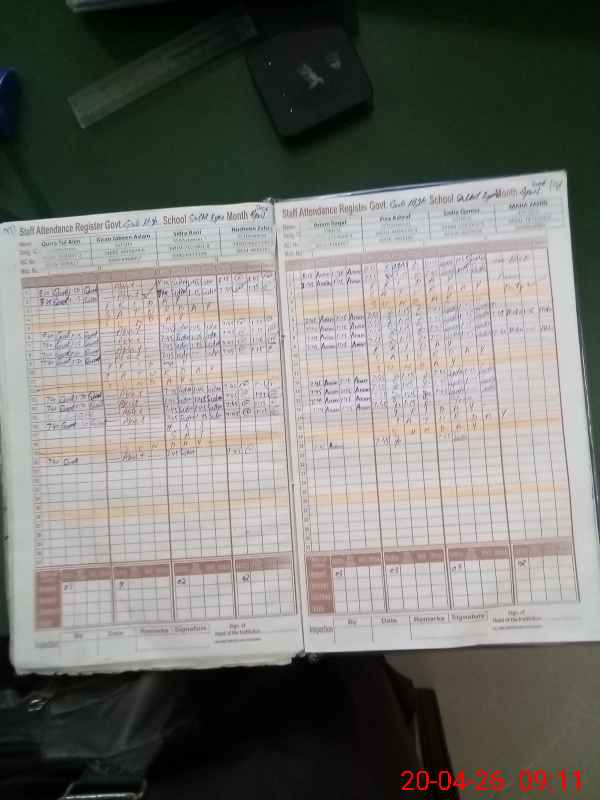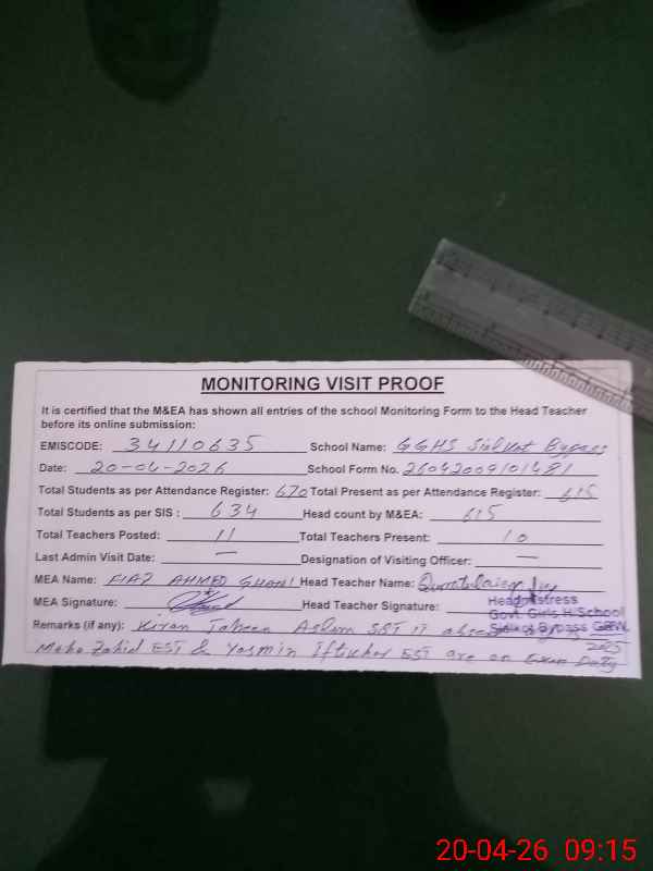 | Remarks (Use Separate Page if Required): Attendance of teaching staff and students on SIS Software is updated Kiran Jabeen Aslam SST IT absent from her duty w e f 25 Aug, 2025 Maha Zahid EST and Yasmin Iftikhar EST are on Exam duty Abbas Ali LA is performing his duty at Commissioner Office Gujranwala Data as per provided by School Staff and found during physical visit | |||||