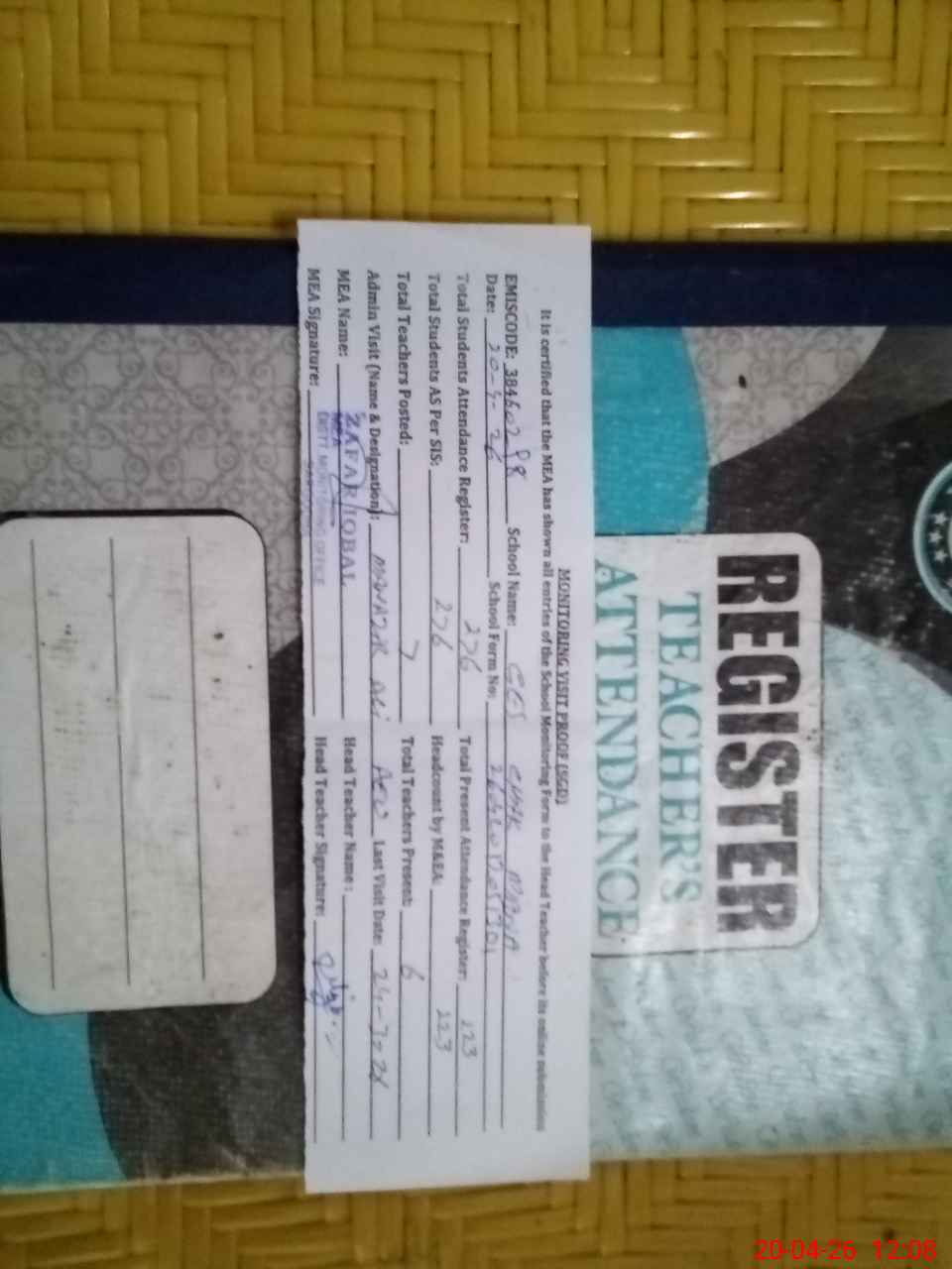 | Attendance Register | Head Teacher | MEA with School | Visit Proof |
