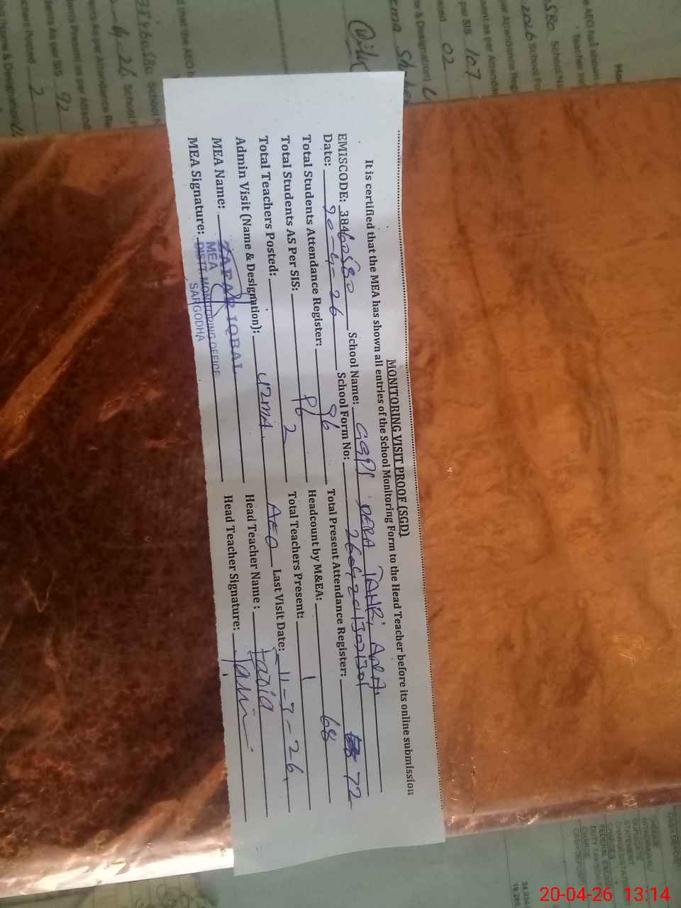 | Attendance Register | Head Teacher | MEA with School | Visit Proof |