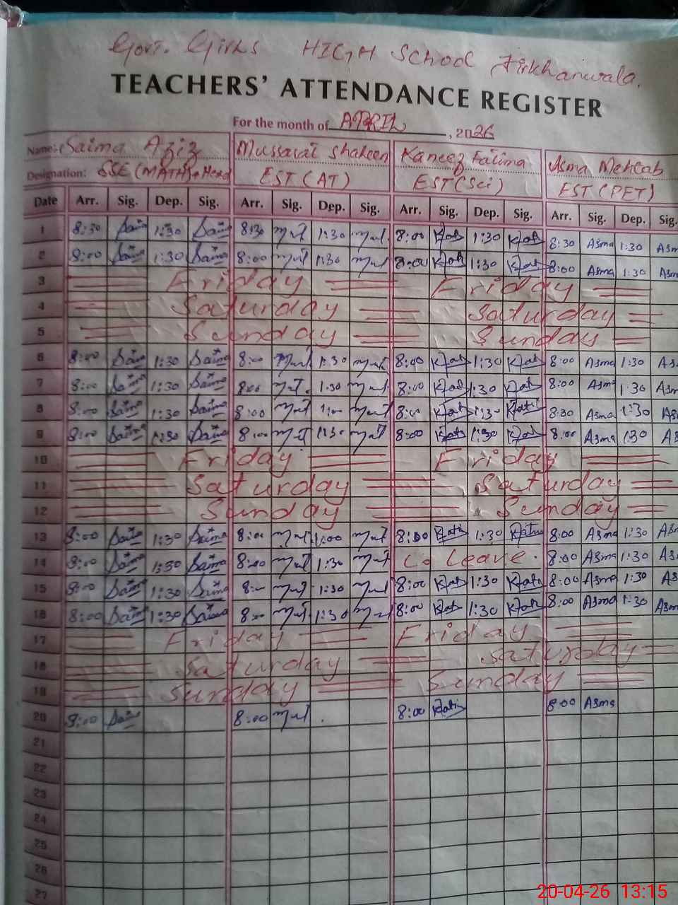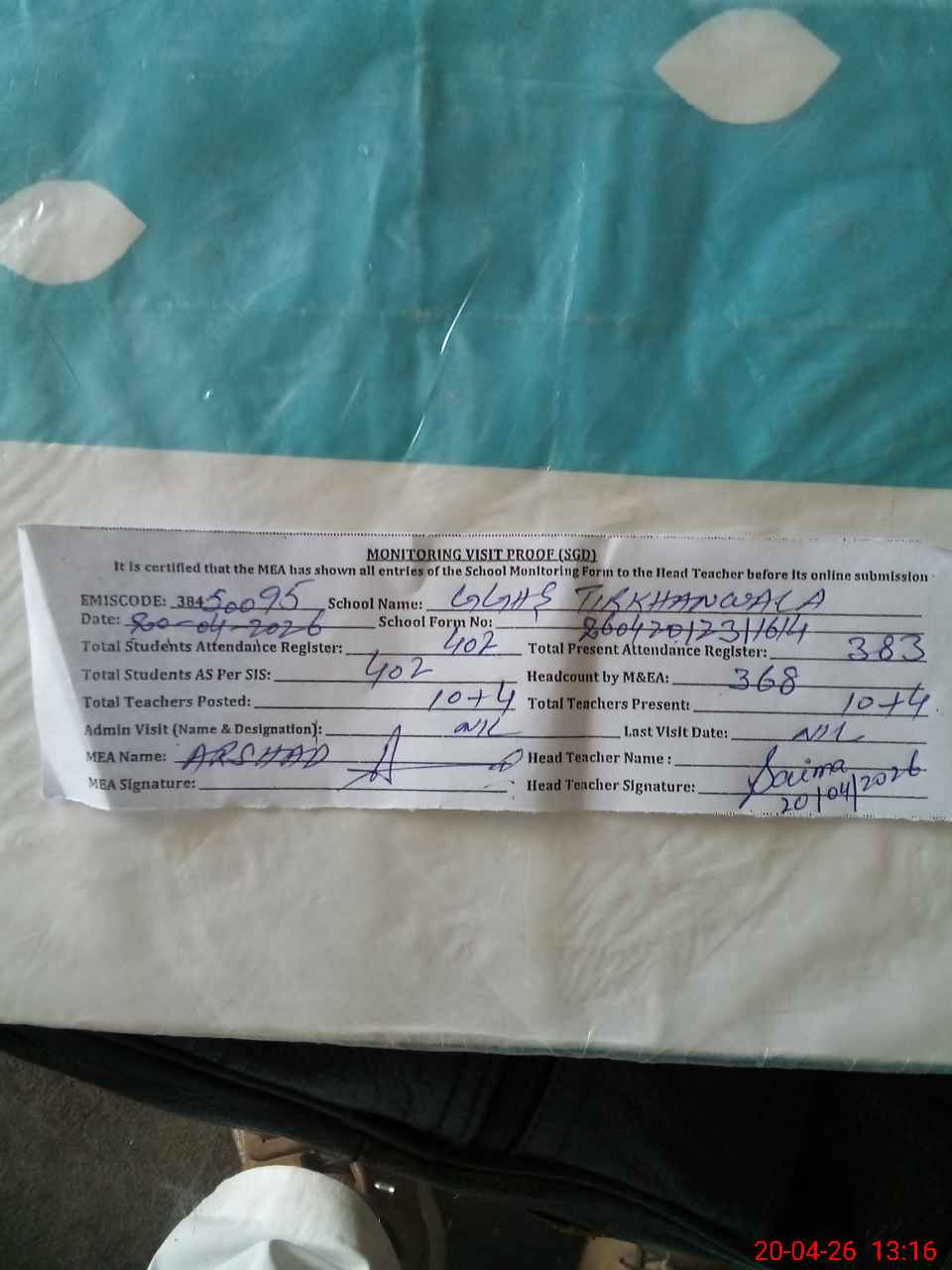 | Attendance Register | Head Teacher | MEA with School | Visit Proof |