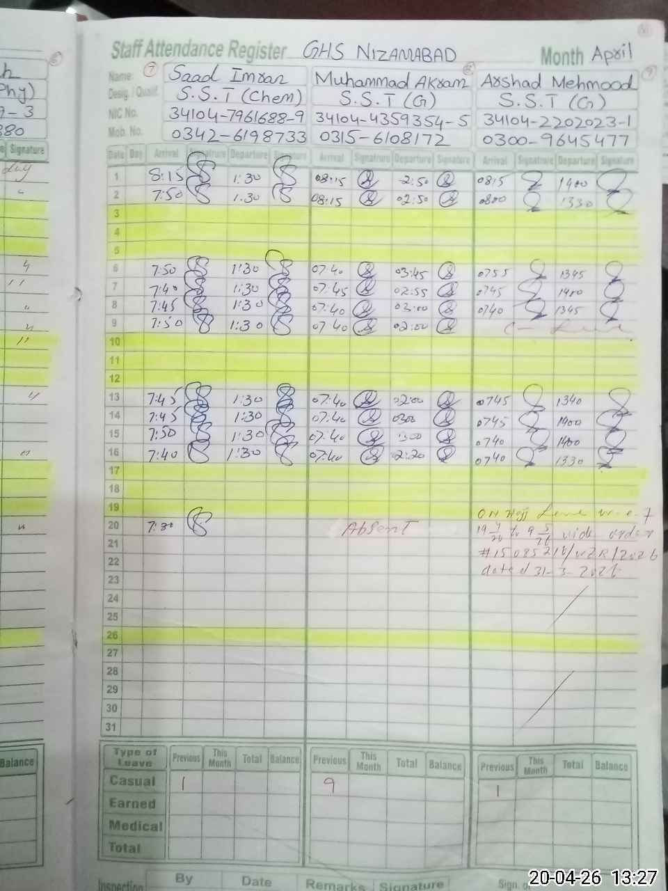 | CNIC | Full Name | Designation | R/C | Absence During Last Calender Month |