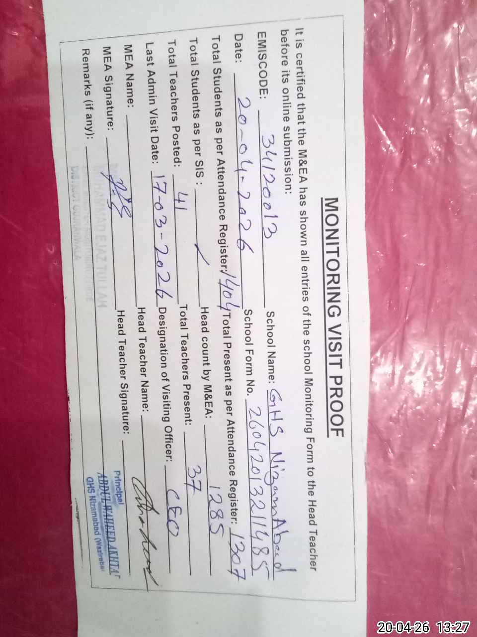| Attendance Register | Head Teacher | MEA with School | Visit Proof |