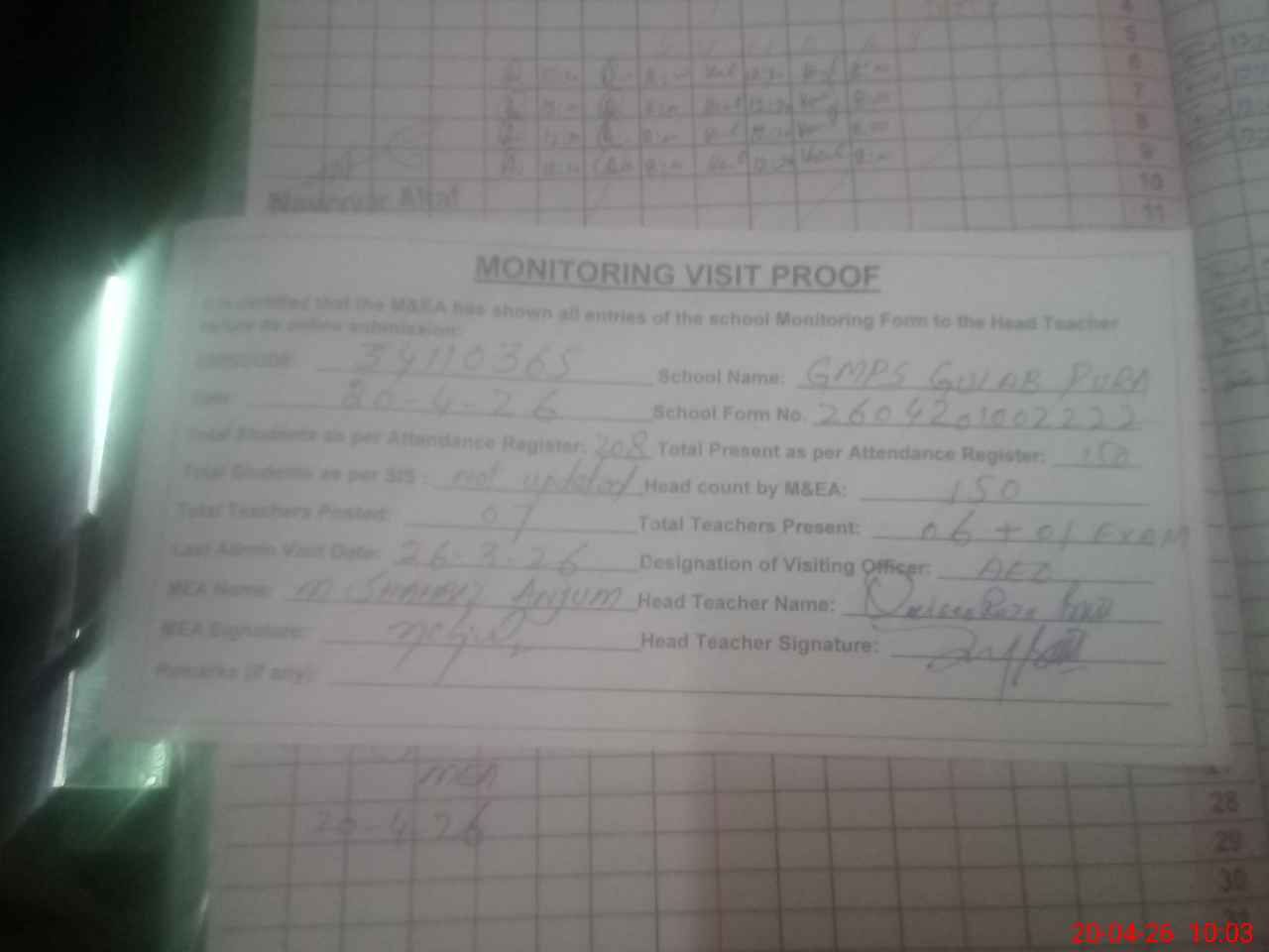 | Attendance Register | Head Teacher | MEA with School | Visit Proof |
