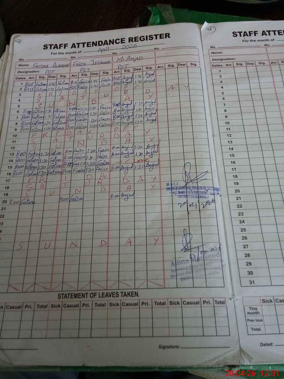 | CNIC | Full Name | Designation | R/C | Absence During Last Calender Month |