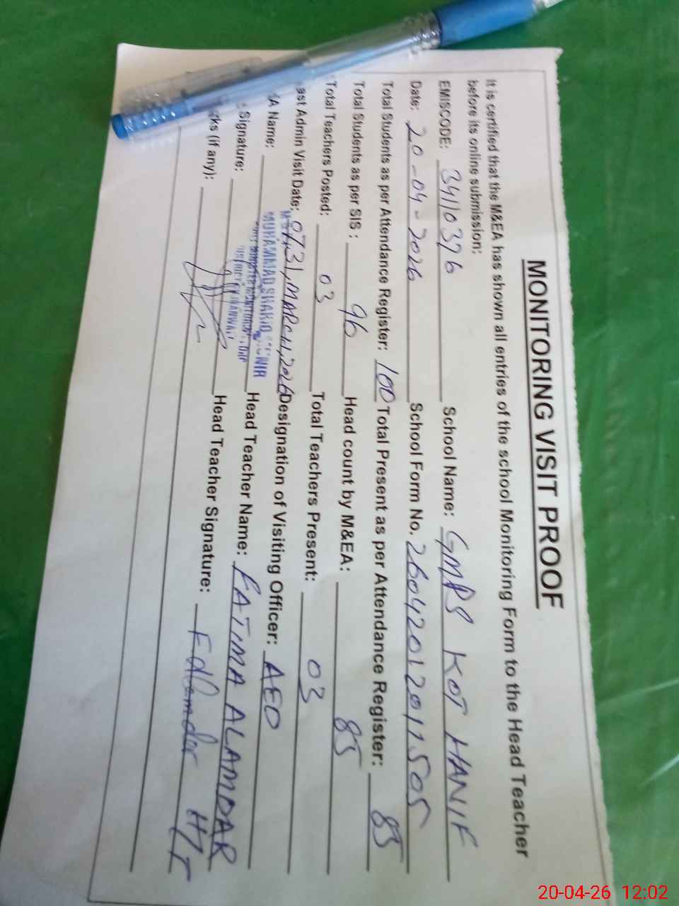 | Attendance Register | Head Teacher | MEA with School | Visit Proof |