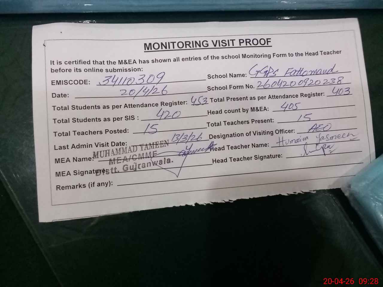 | EMIS Code: 34110309 | Name of School: GGPS FATOMAND GUJRANWALA | |||