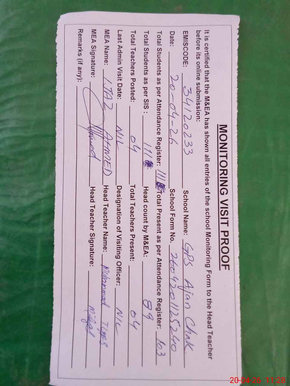 | EMIS Code: 34120233 | Name of School: GPS AJAN CHAK | |||
