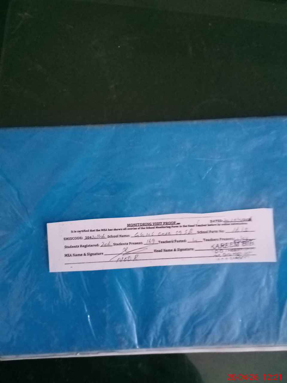 | Attendance Register | Head Teacher | MEA with School | Visit Proof |