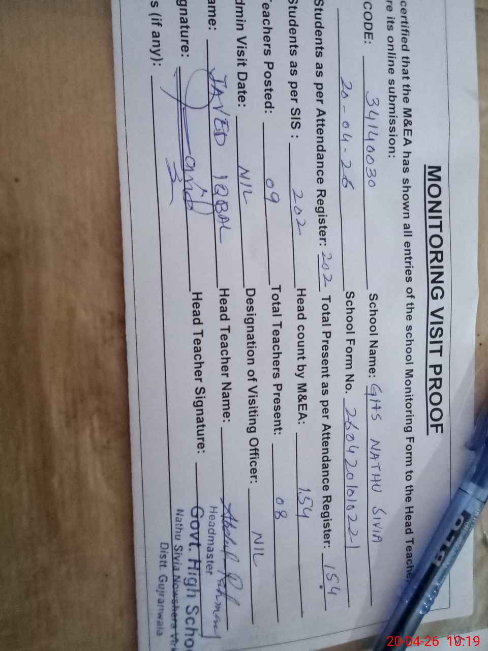 | Attendance Register | Head Teacher | MEA with School | Visit Proof |