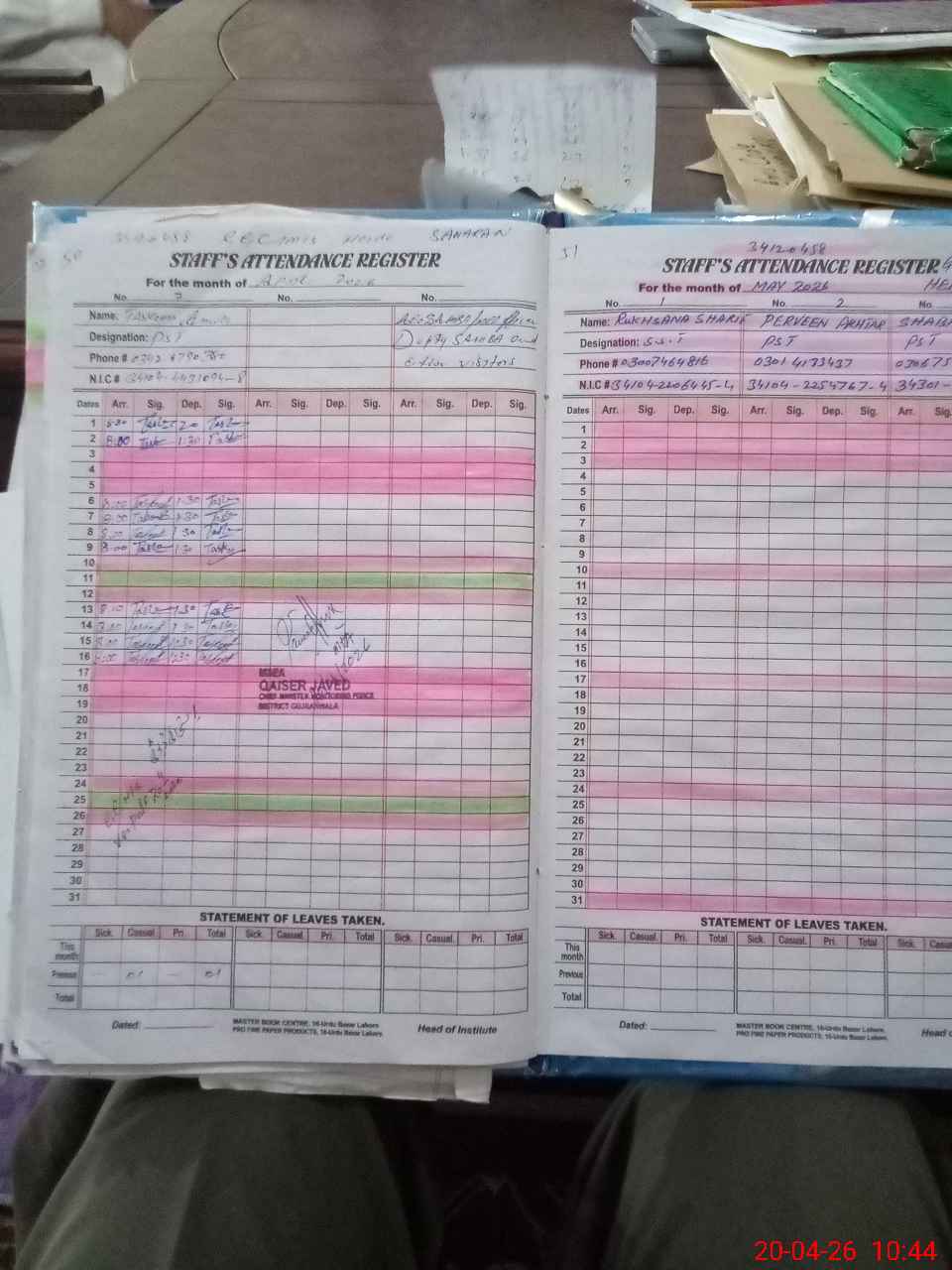 | CNIC | Full Name | Designation | R/C | Absence During Last Calender Month |