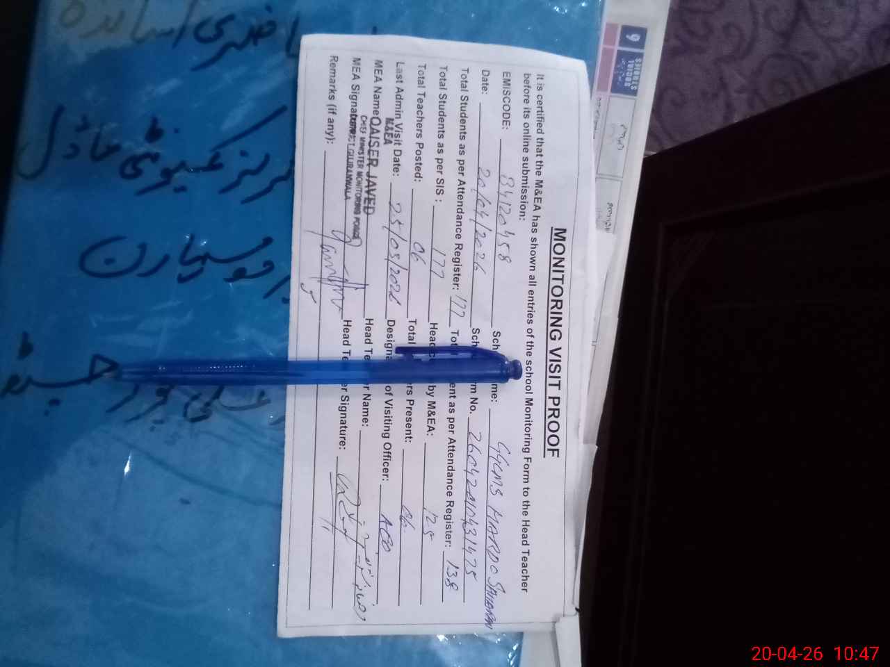 | Attendance Register | Head Teacher | MEA with School | Visit Proof |