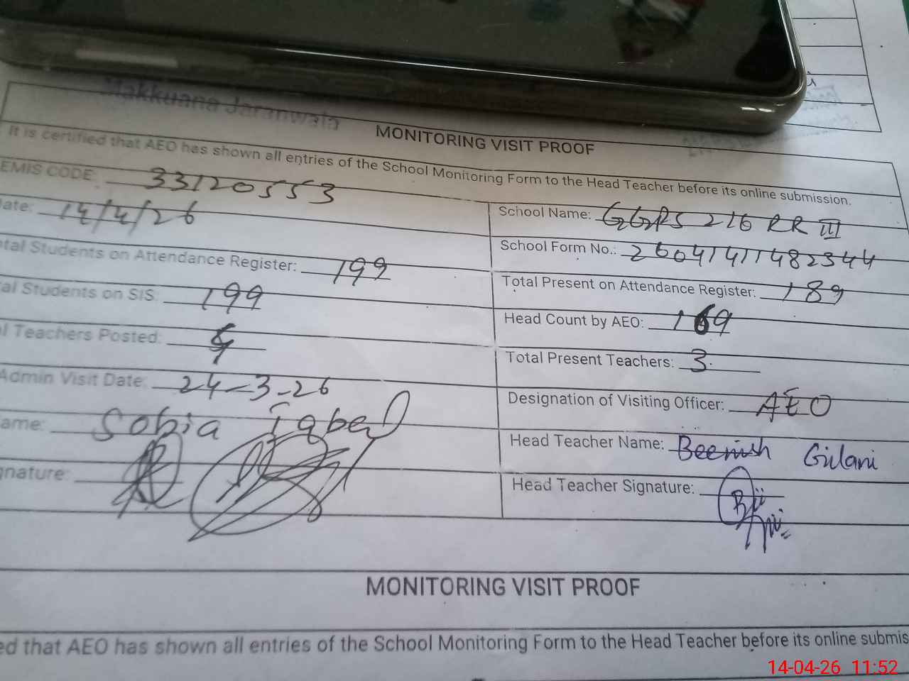 | Attendance Register | Head Teacher | MEA with School | Visit Proof |