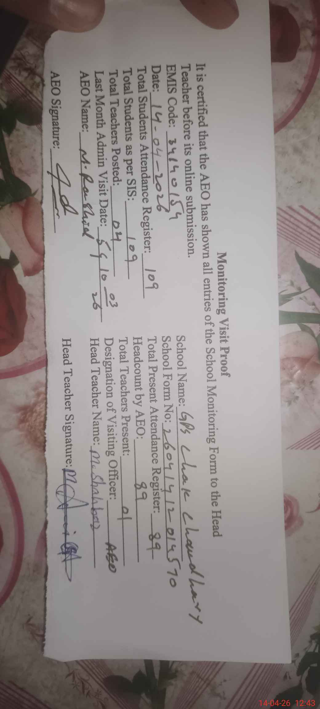 | Attendance Register | Head Teacher | MEA with School | Visit Proof |