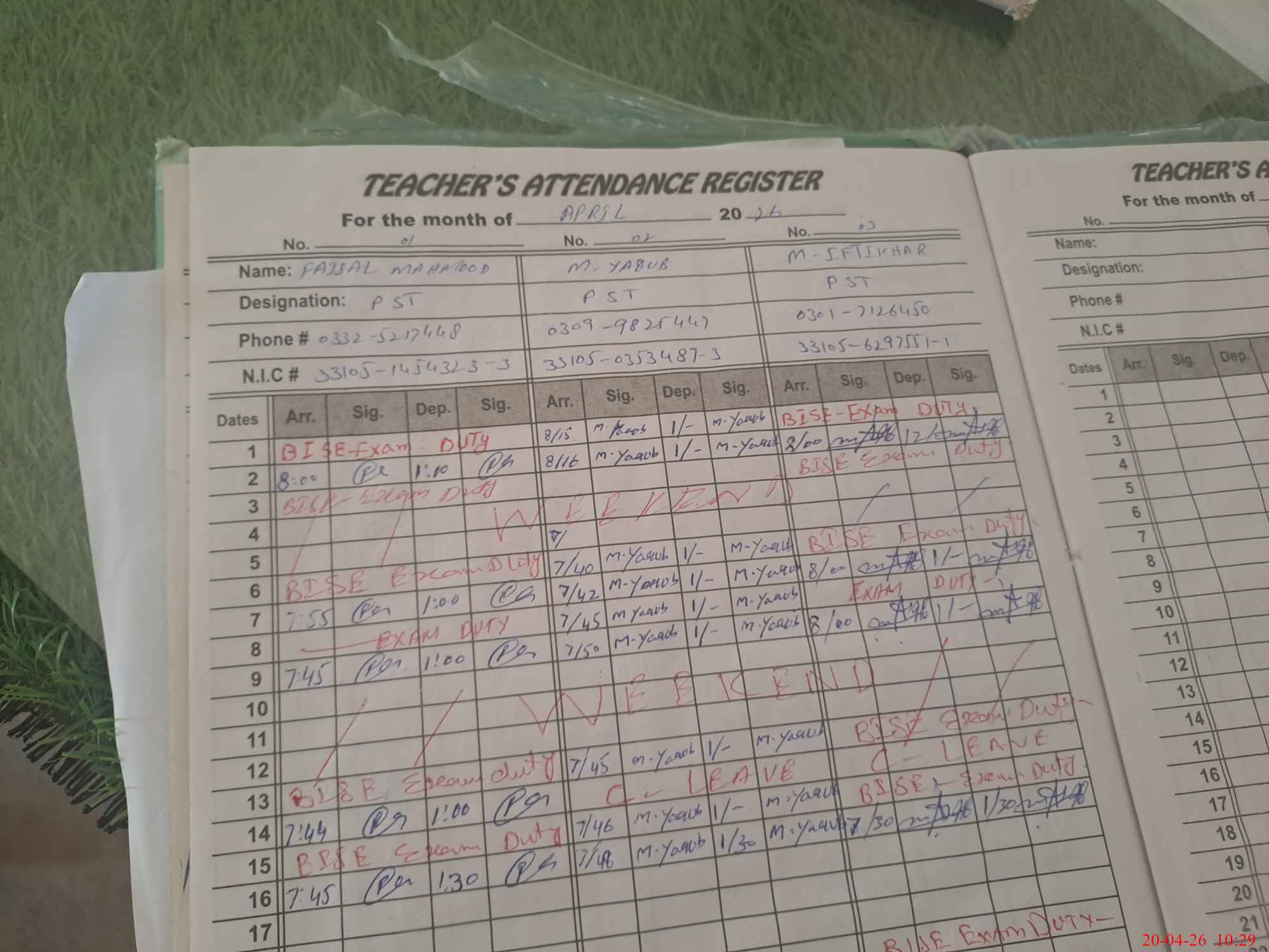 | CNIC | Full Name | Designation | R/C | Absence During Last Calender Month |