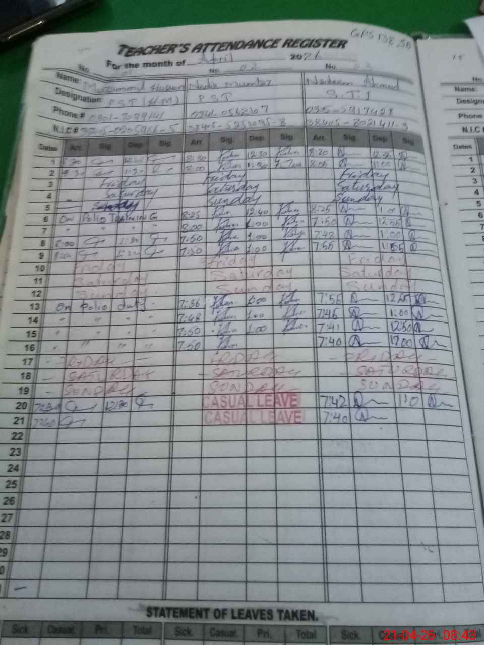 | CNIC | Full Name | Designation | R/C | Absence during last cal. month |
