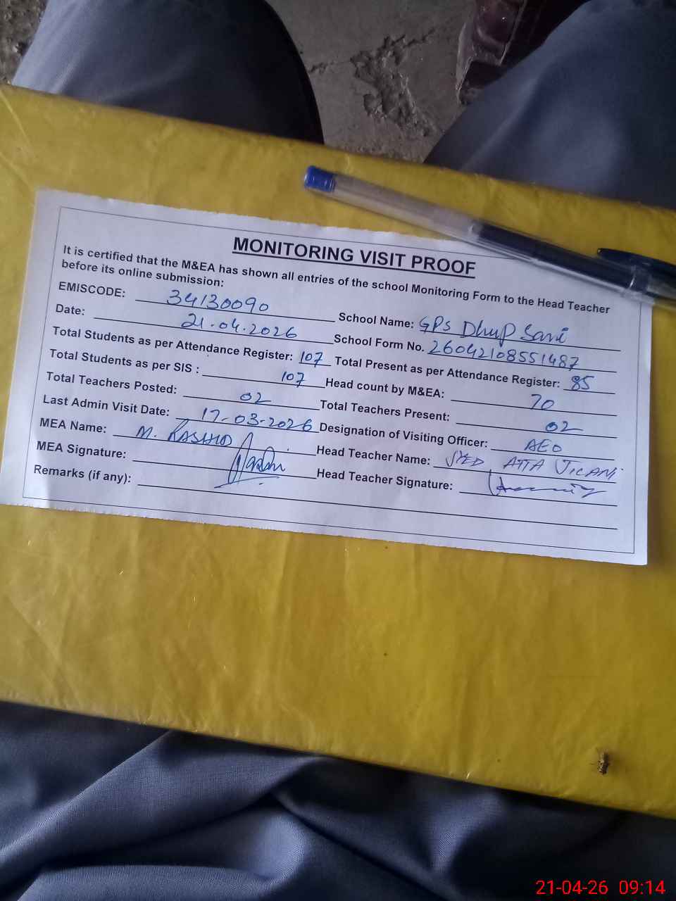 | Attendance Register | Head Teacher | MEA with School | Visit Proof |