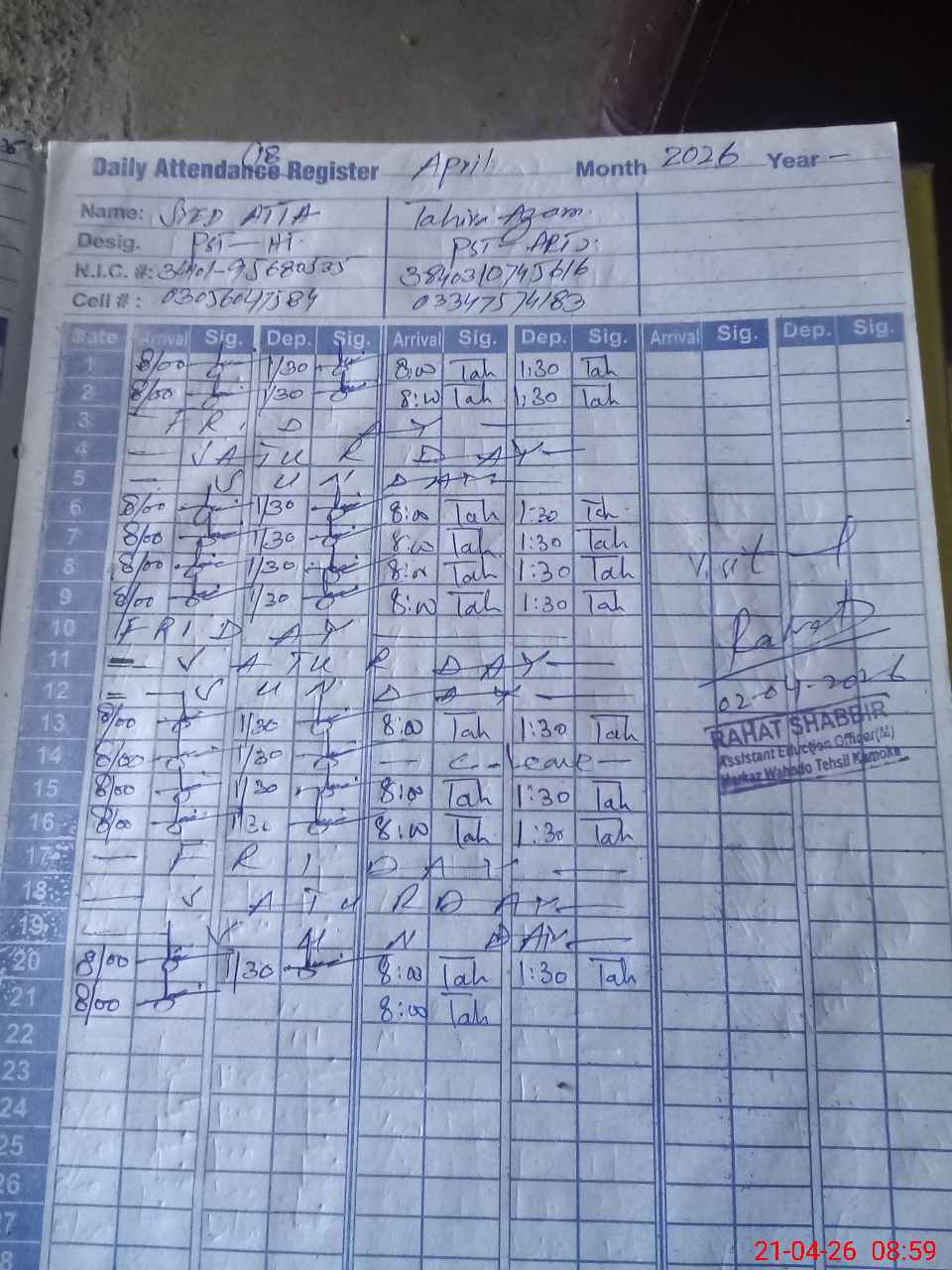 | CNIC | Full Name | Designation | R/C | Absence during last cal. month |