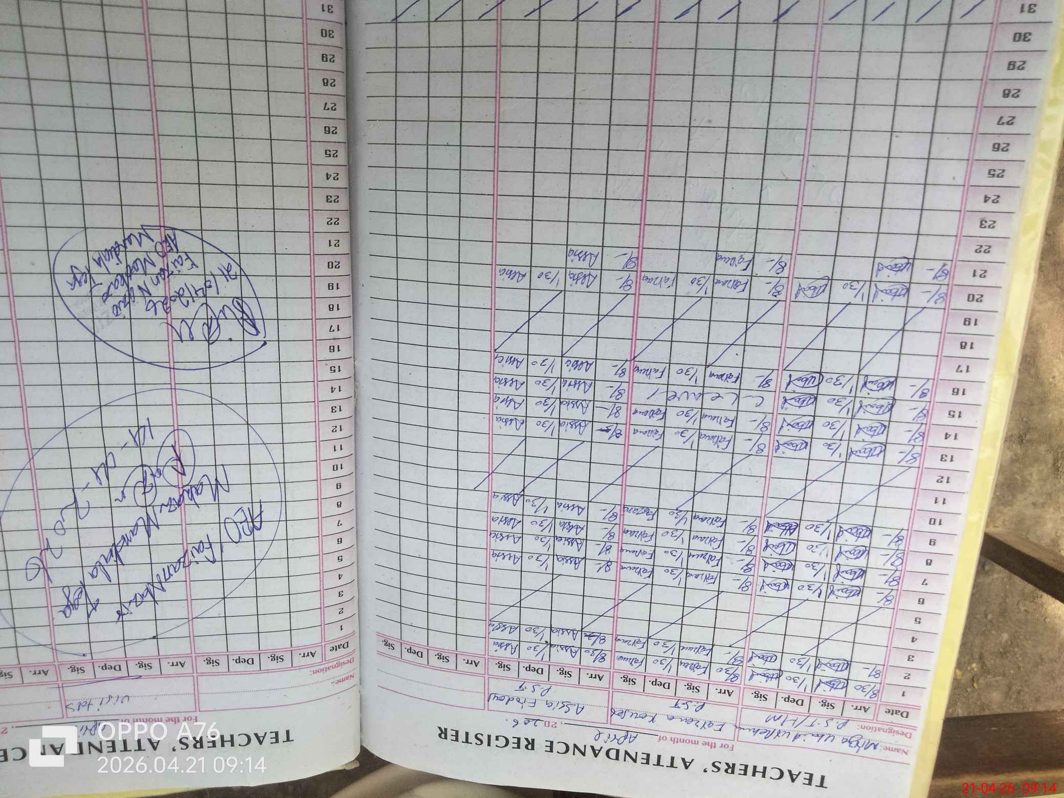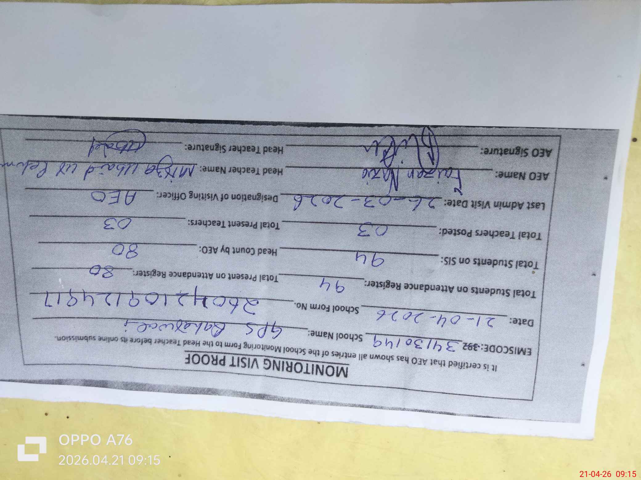 | Attendance Register | Head Teacher | MEA with School | Visit Proof |