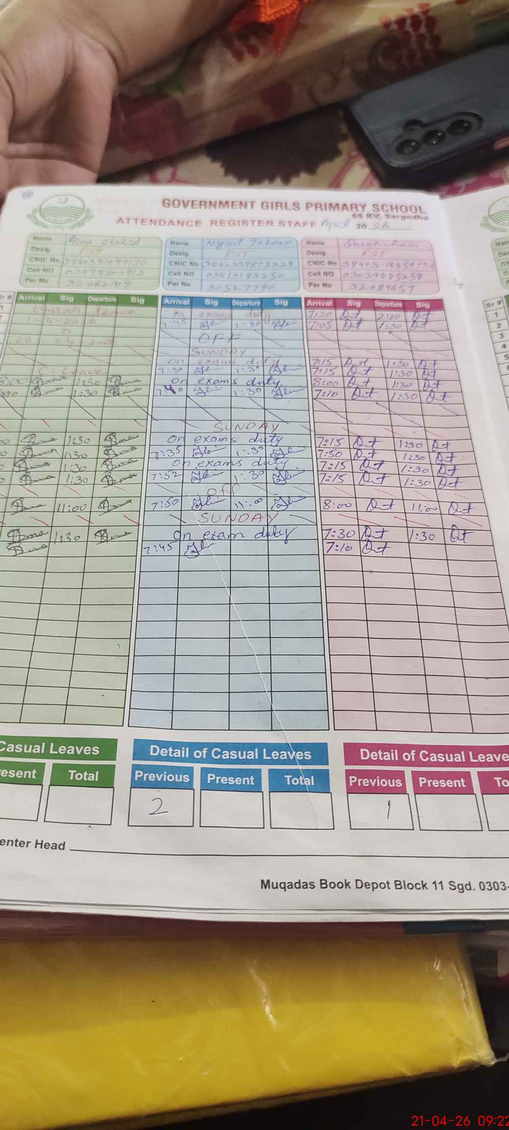 | CNIC | Full Name | Designation | R/C | Absence during last cal. month |