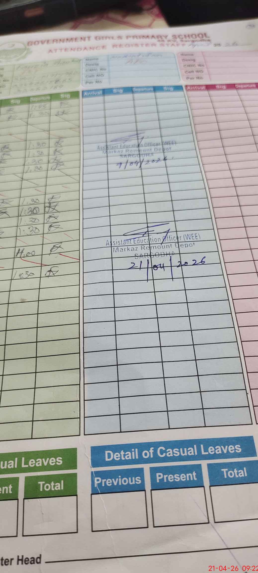 | Name: AS**** SH**** Designation: (School Headmaster's/Headmistress's) PST Phone/Cell Number: 03**** |