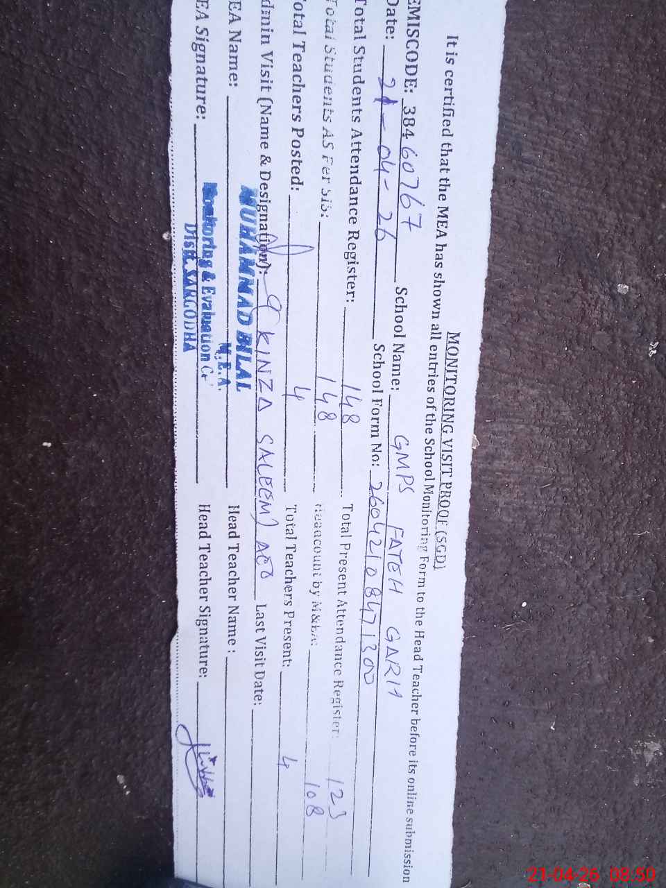 | Attendance Register | Head Teacher | MEA with School | Visit Proof |