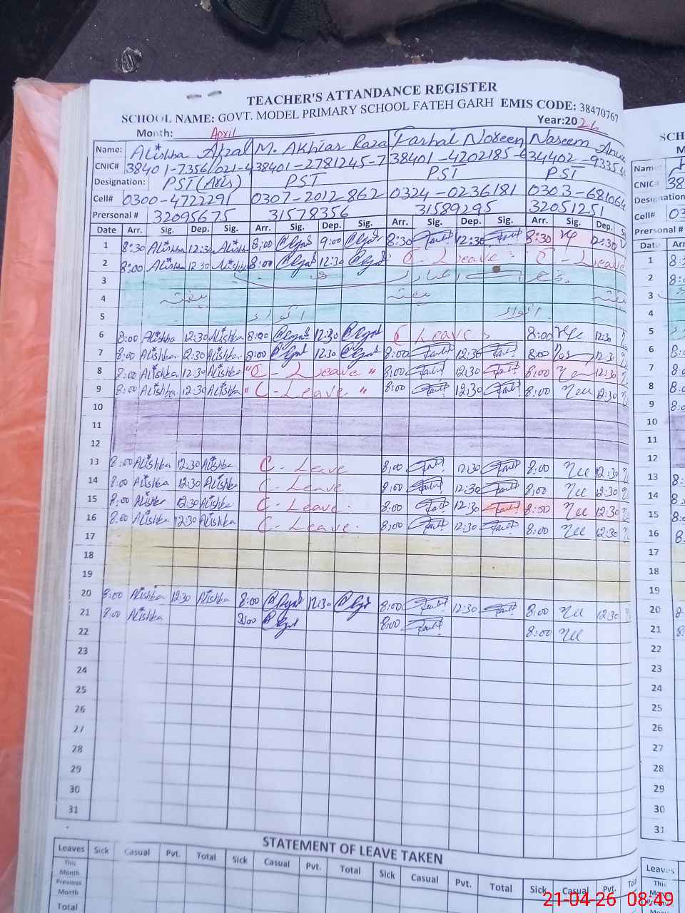 | CNIC | Full Name | Designation | R/C | Absence During Last Calender Month |