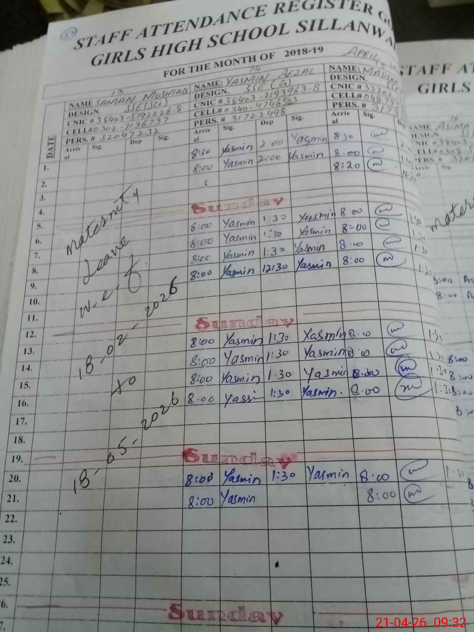 | CNIC | Full Name | Designation | R/C | Absence During Last Calender Month |