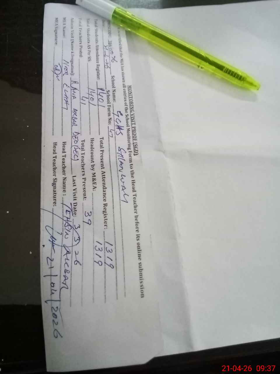 | Attendance Register | Head Teacher | MEA with School | Visit Proof |