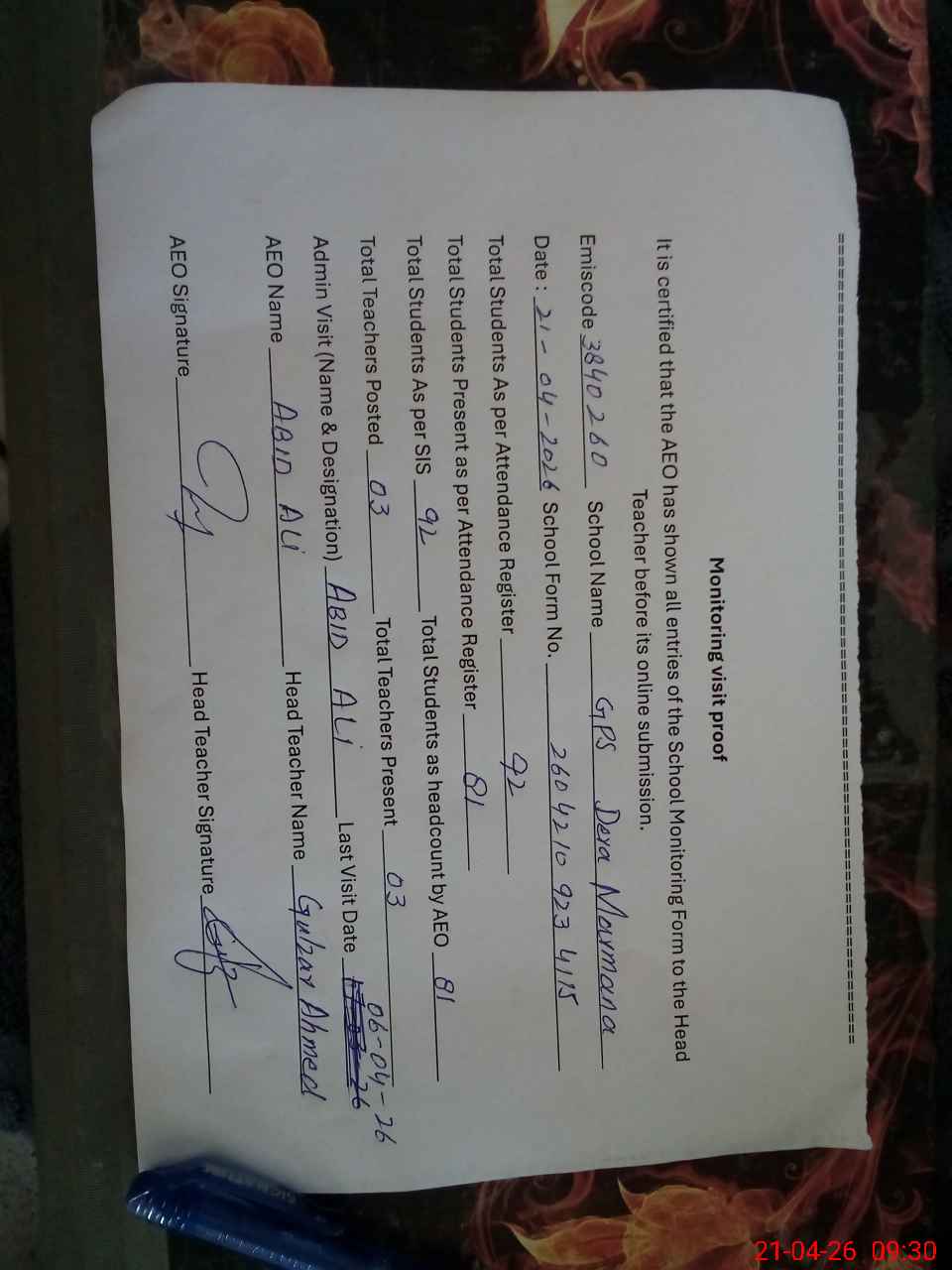 | Certified that this School was Inspected by the Undersigned MEA/DMO Today and the Information Stated Above is as Per Record. | |||||