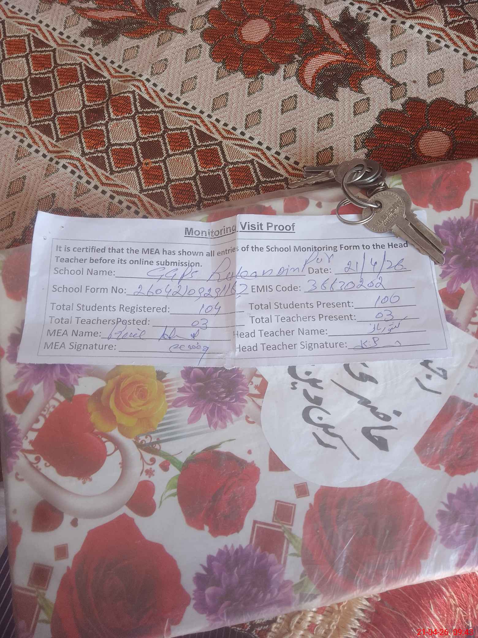 | Attendance Register | Head Teacher | MEA with School | Visit Proof |